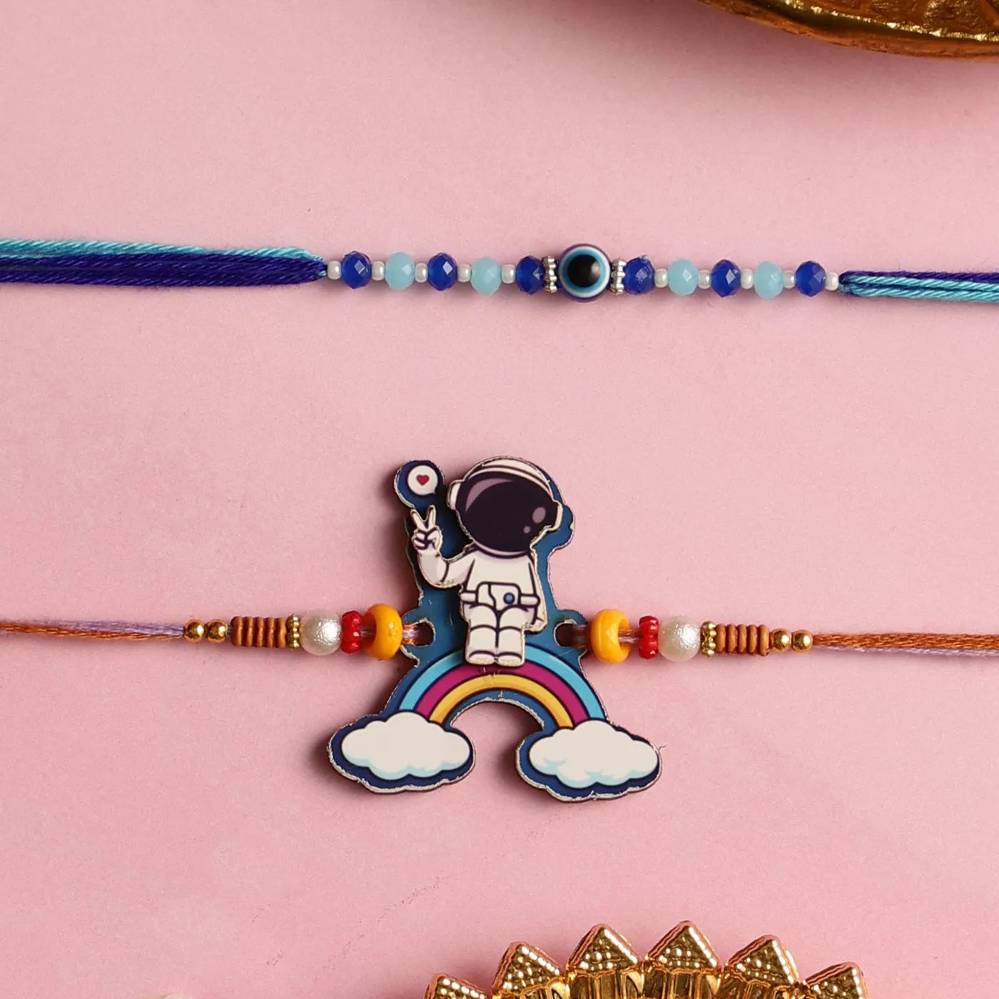 The set includes a charming Astronaut Rakhi and a symbolic Evil Eye Rakhi, perfect for young boys.