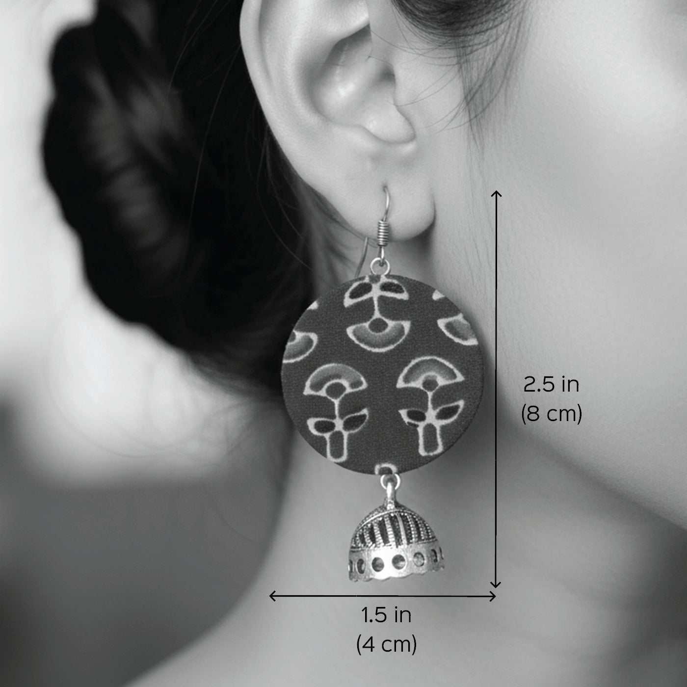 - These handcrafted jhumki earrings showcase traditional block-printed motifs on soft cotton fabric.