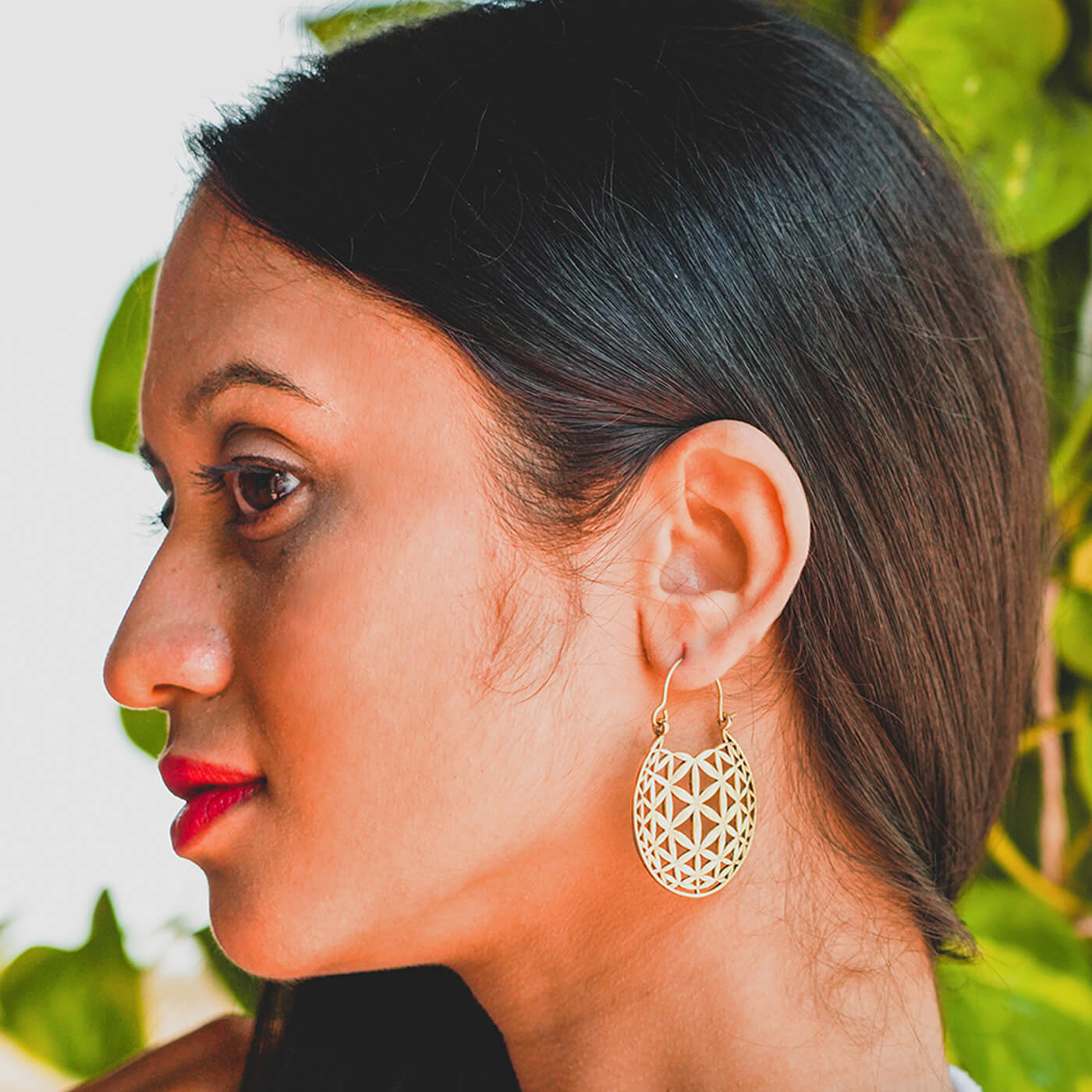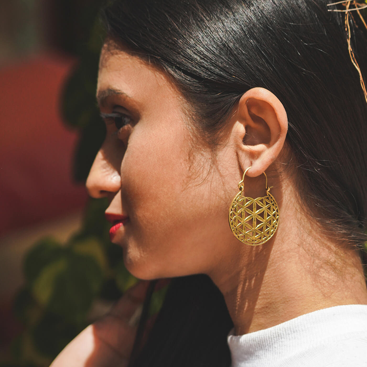 Handmade Brass Modern Hoop Earrings - Floral Pattern