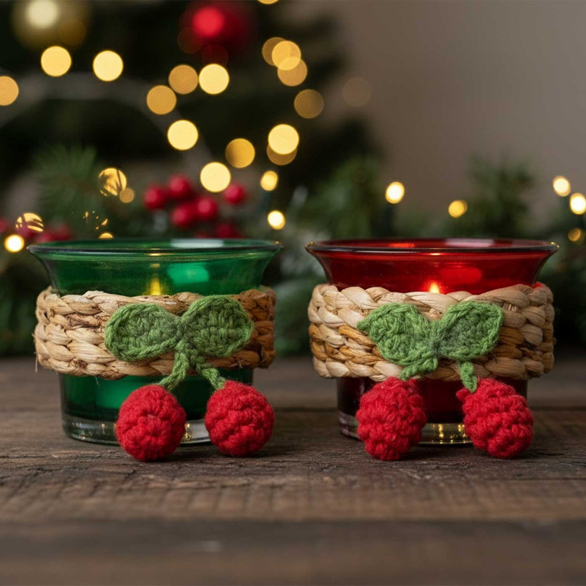 - Each holder features colorful glass bases wrapped in banana bark with crochet cherry accents.