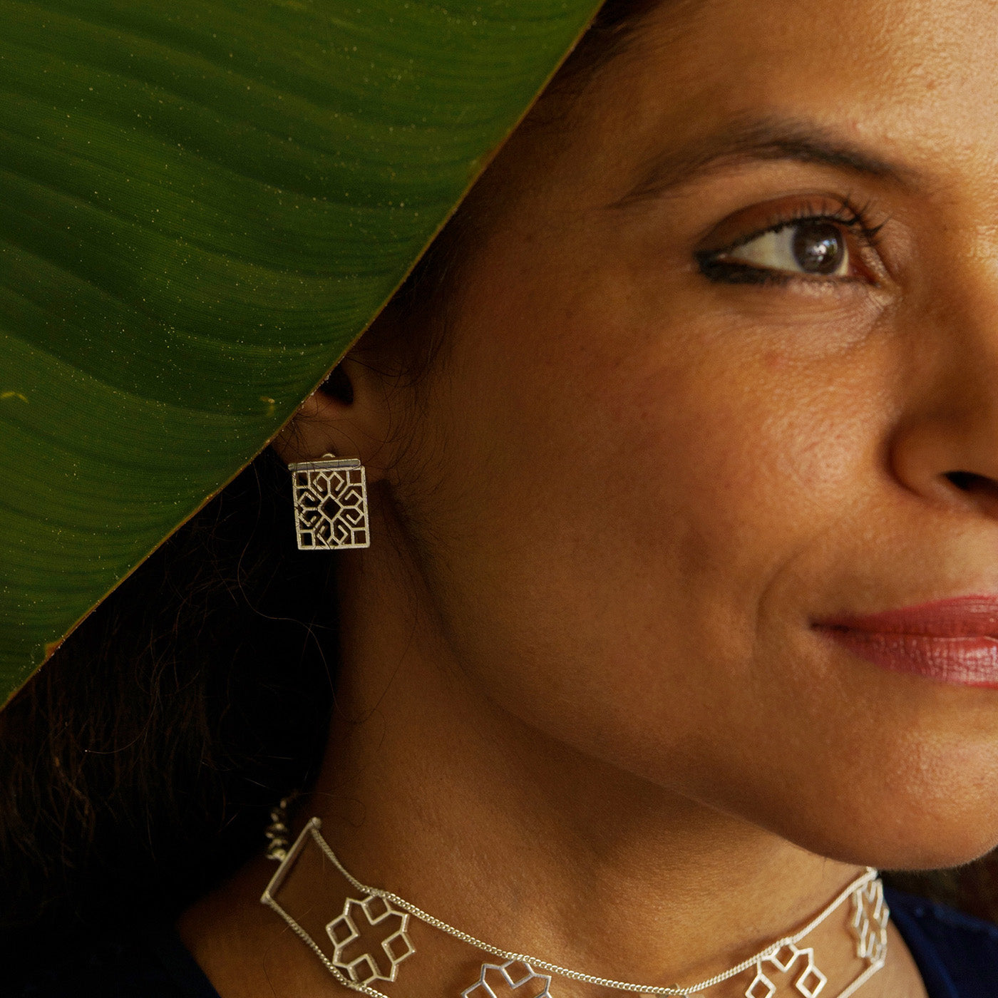 - Handcrafted in 92.5 sterling silver, the detachable square frame reveals intricate Kasuti-inspired motifs.