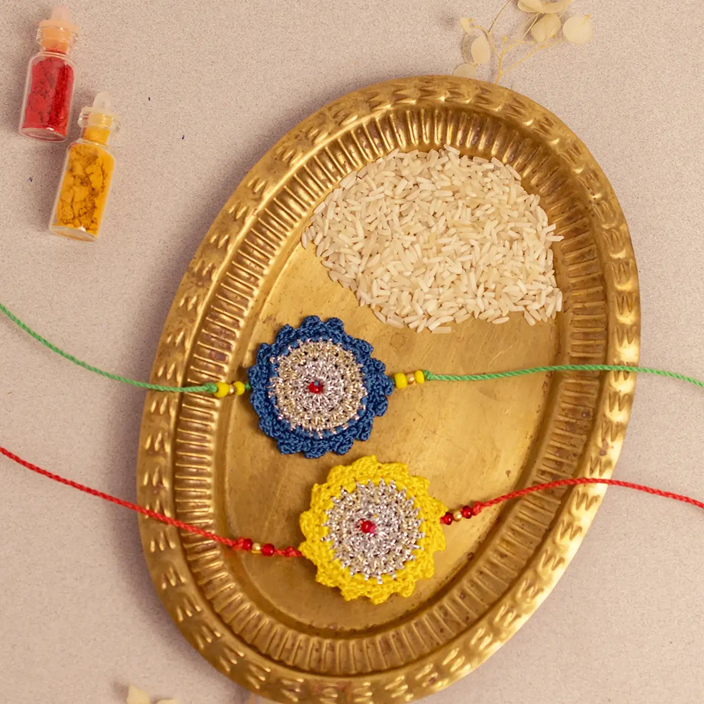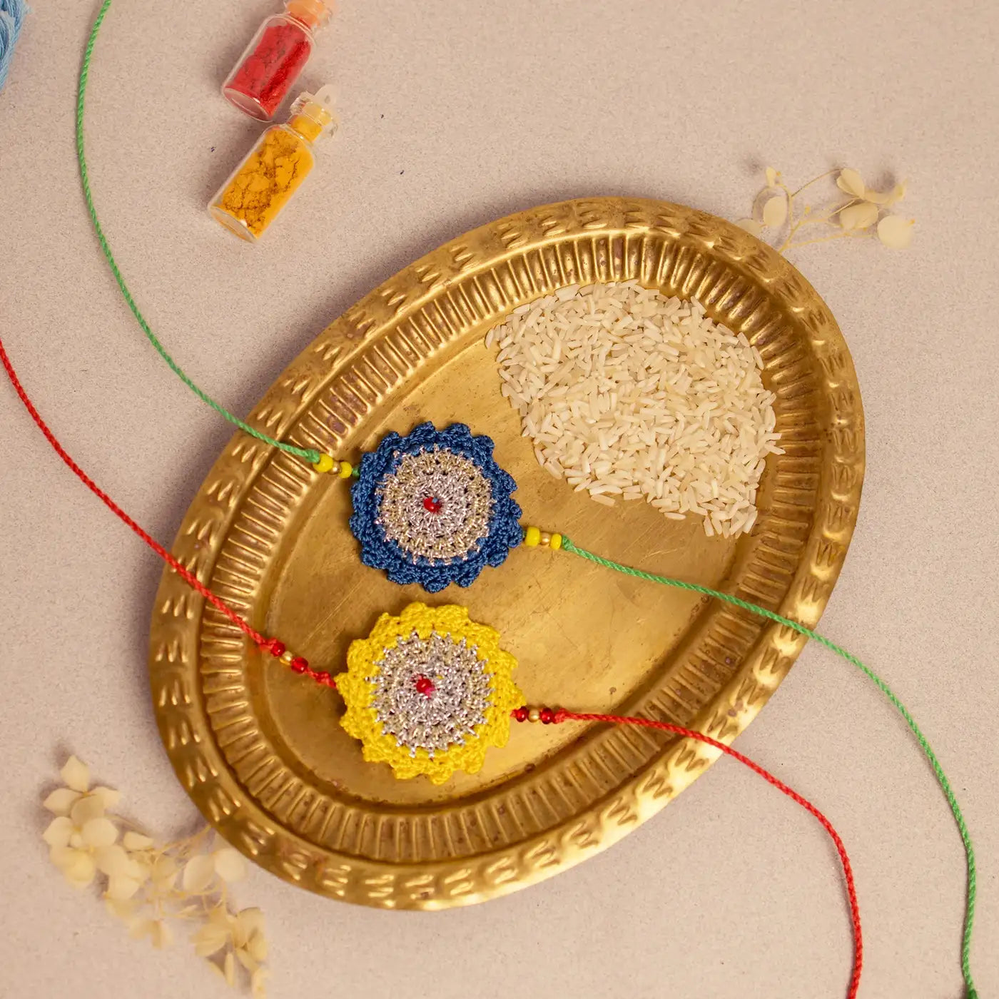 Handmade Crochet Blue & Yellow Seher Rakhi With Roli Chawal | Set Of 2