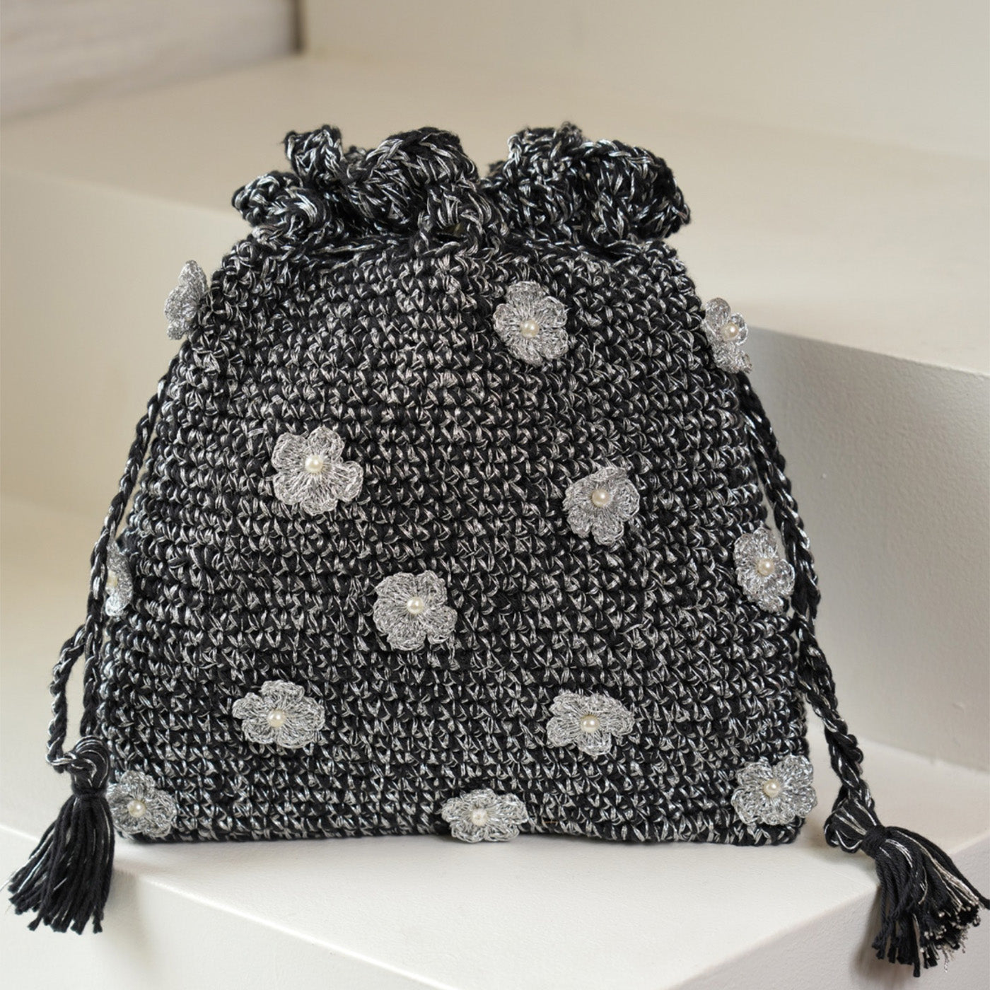 - Radiating the subtle allure of silver threads, this crochet potli captures the spirit of modern festivity.