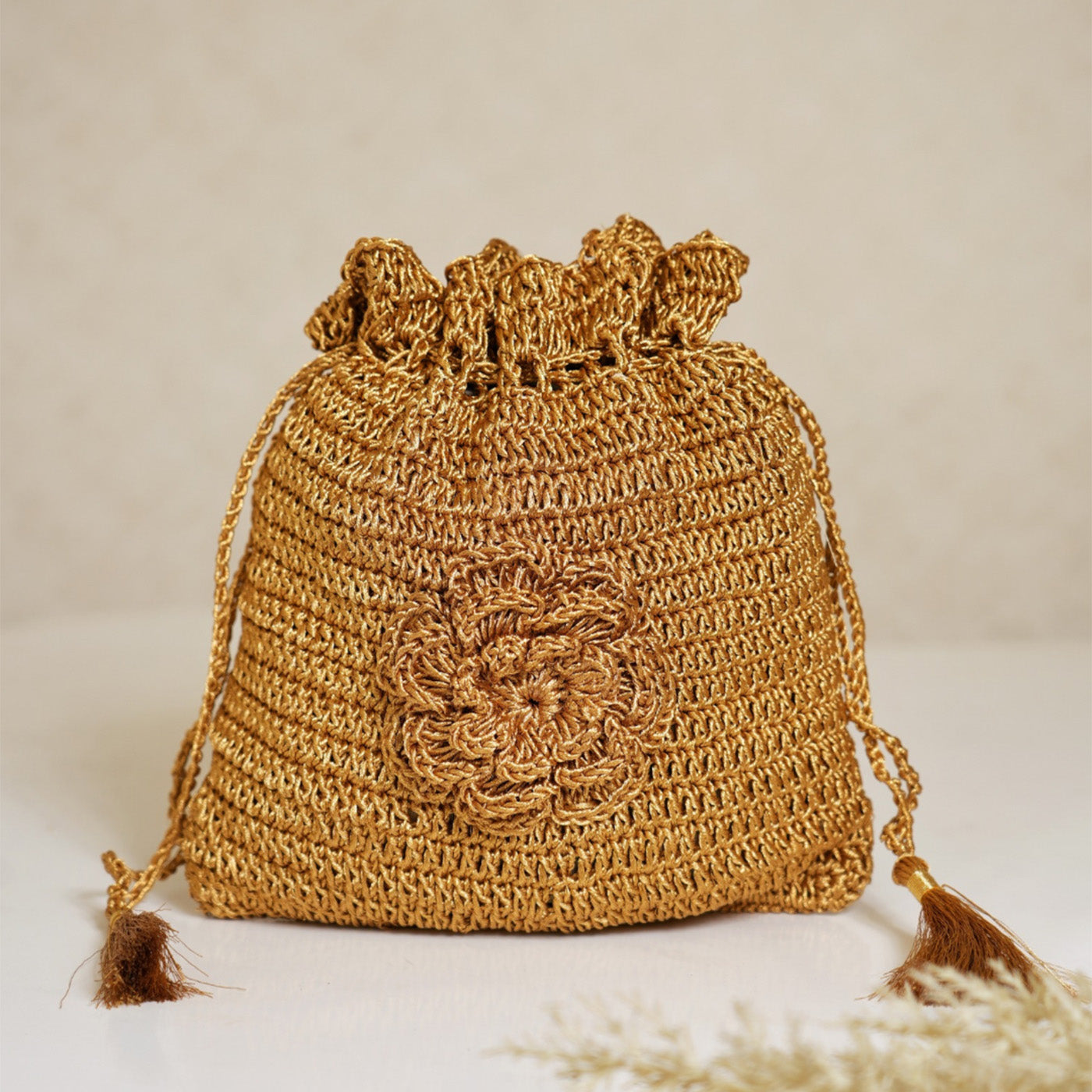 - Radiating the warmth of the marigold bloom, this crochet potli captures the essence of festive grandeur.