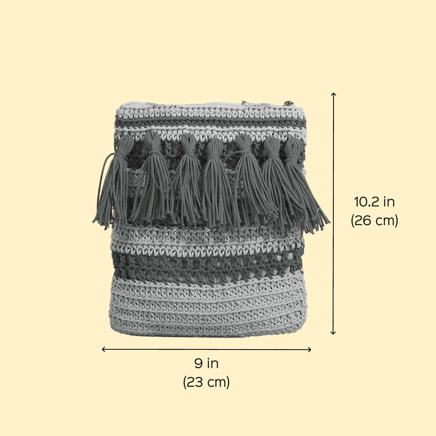 - Woven in striking red and white hues, it carries a playful spirit through its tasseled detailing.