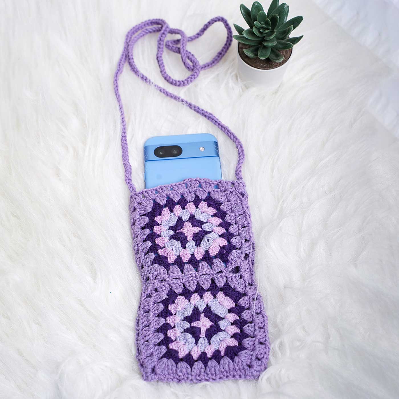 - Wrap your phone in calm with this lavender crochet mobile sling bag. Handcrafted from soft cotton yarn, its soothing shade adds a touch of serene sophistication to any outfit. Lightweight and functional, it's the perfect accessory for hands-free convenience while keeping your style effortlessly chic.