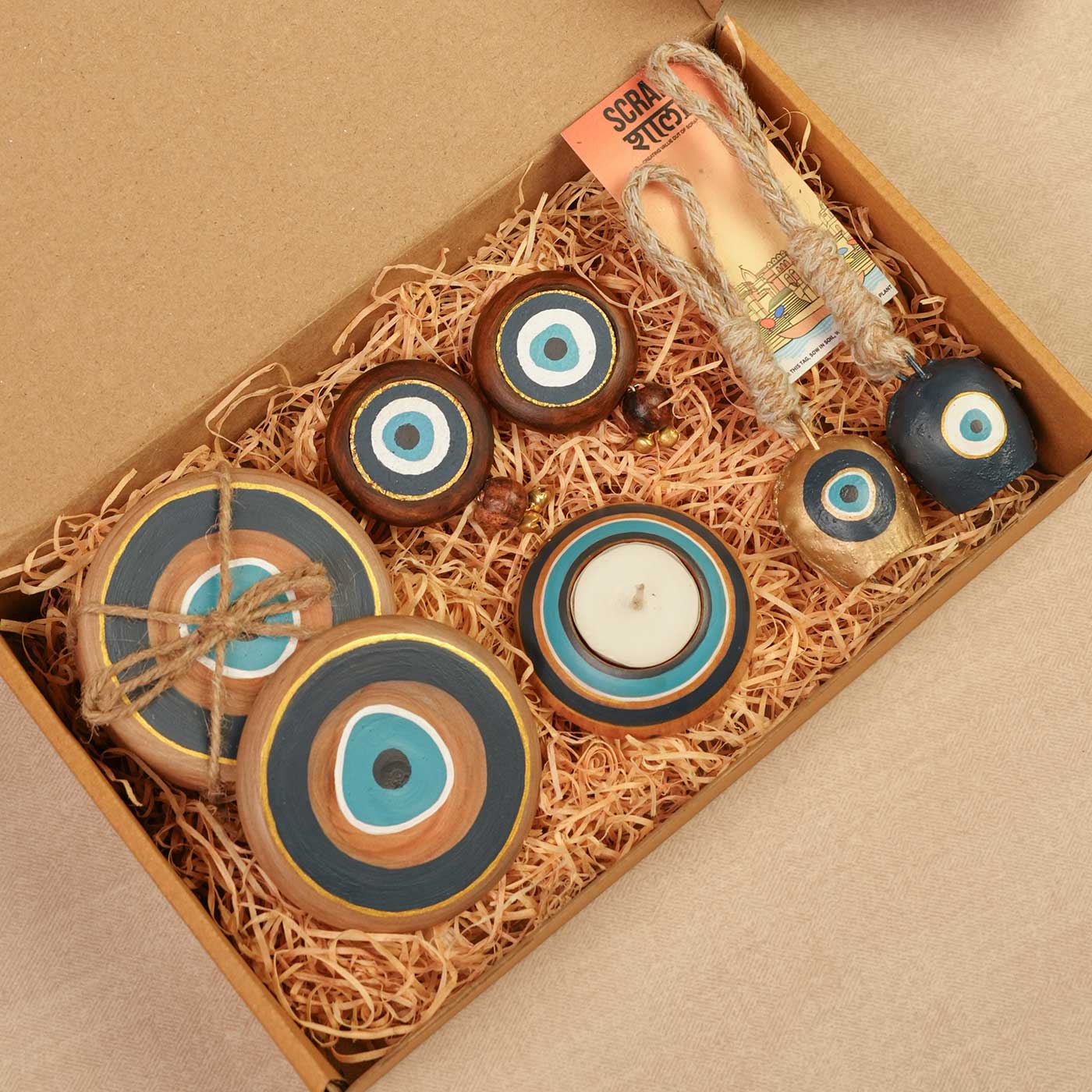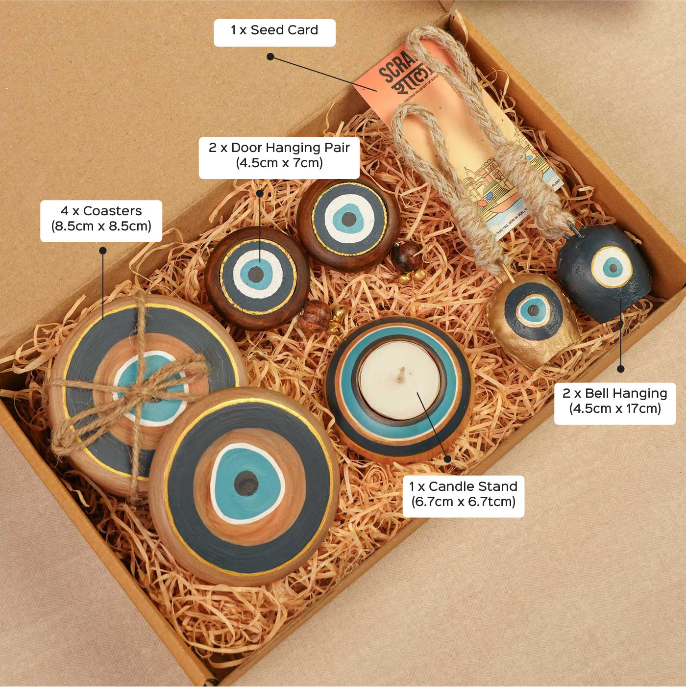 - Includes Evil Eye door hangings, coasters, candle stand, bell hangings, and a plantable seed card.