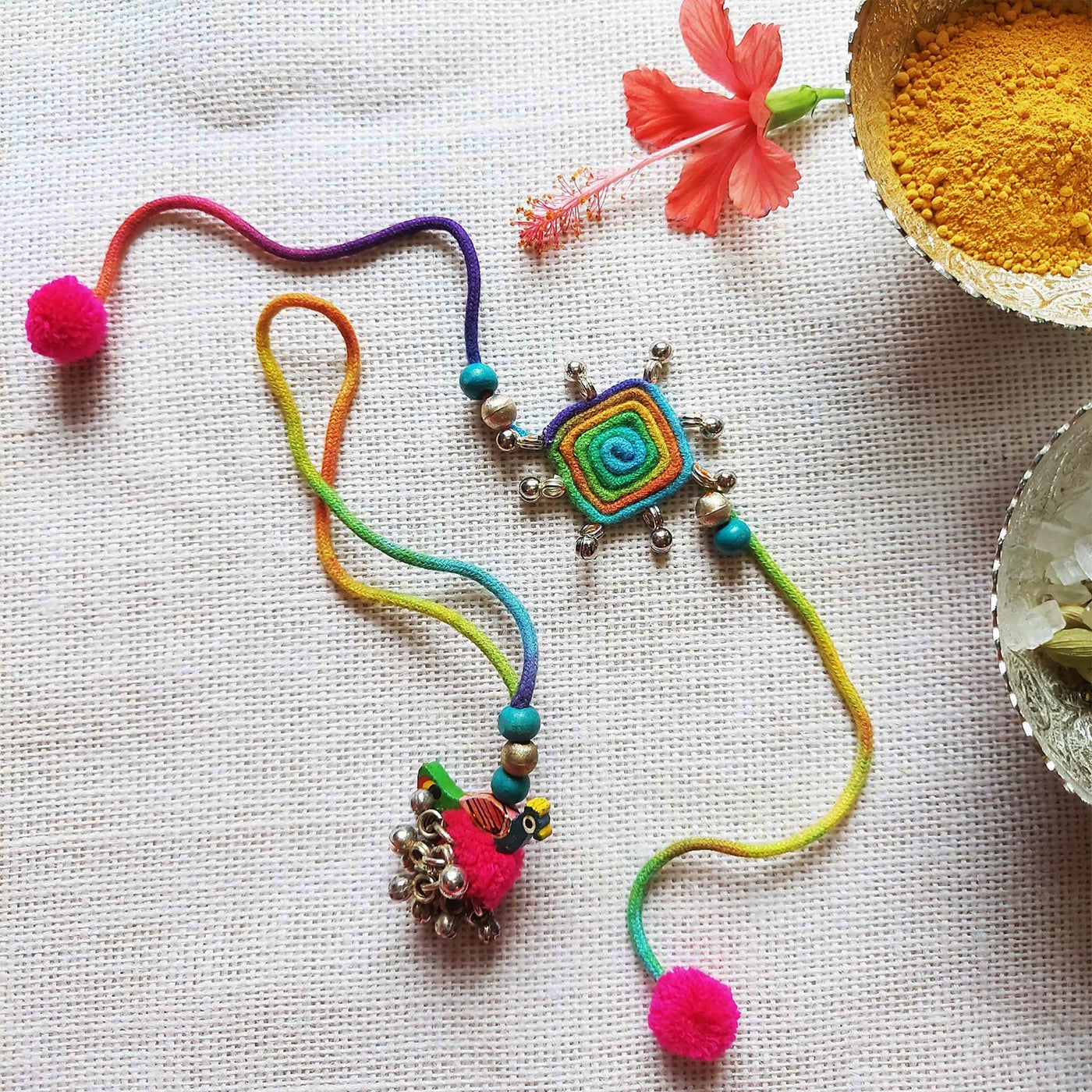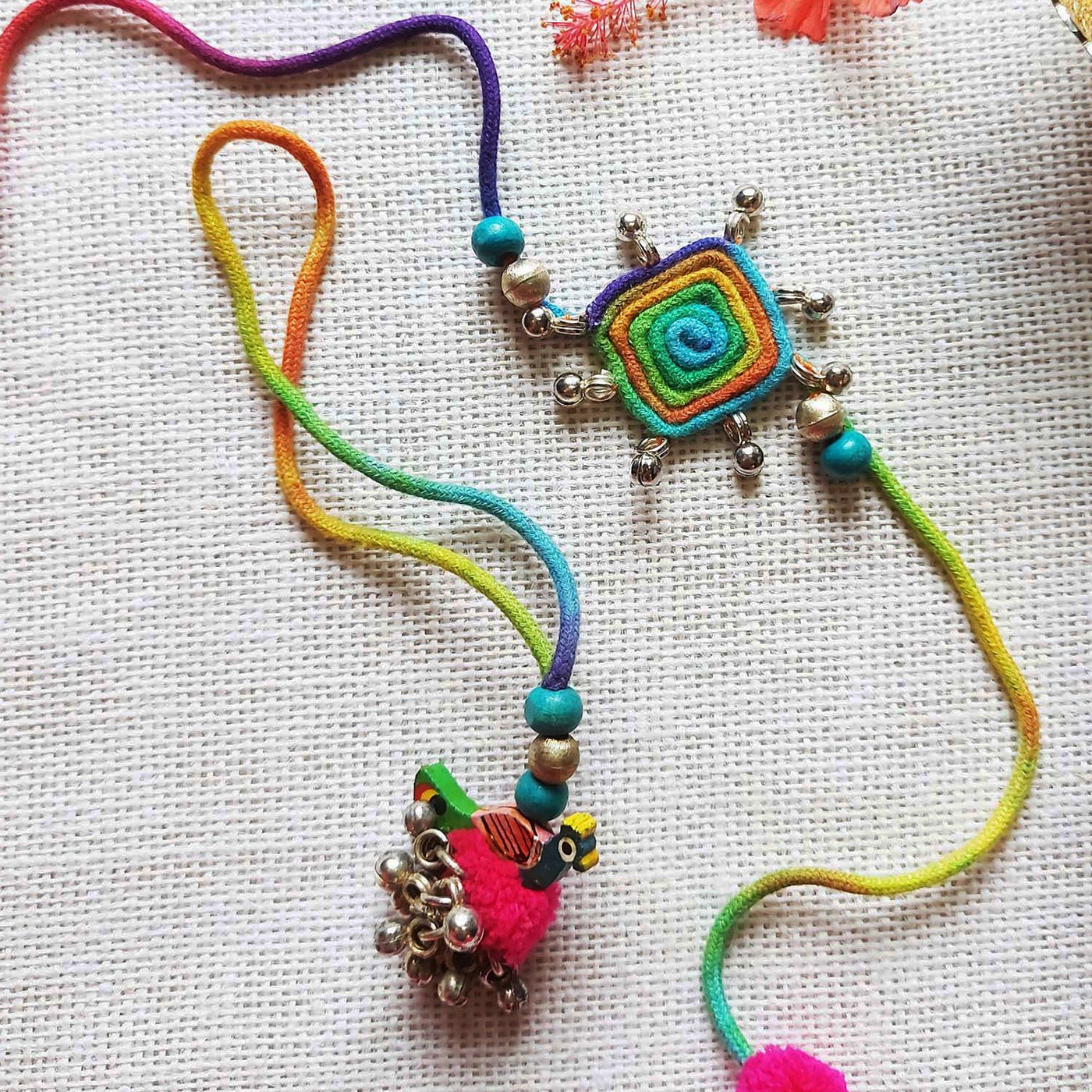 Celebrate Raksha Bandhan with this vibrant handcrafted Rakhi and Lumba set, featuring intricate dori work.