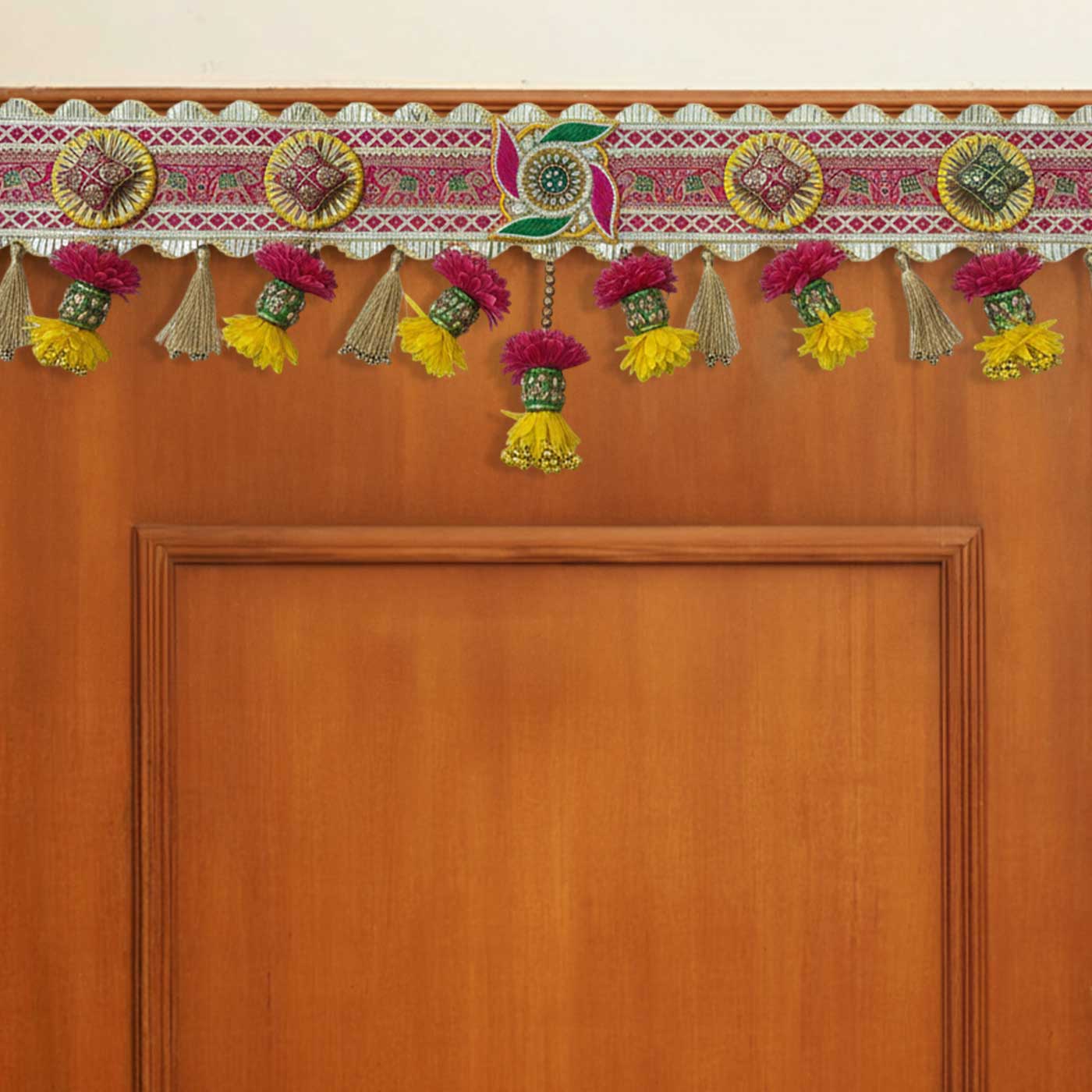 • Enhance your doorway with this handcrafted toran featuring an embroidered Swastik design.