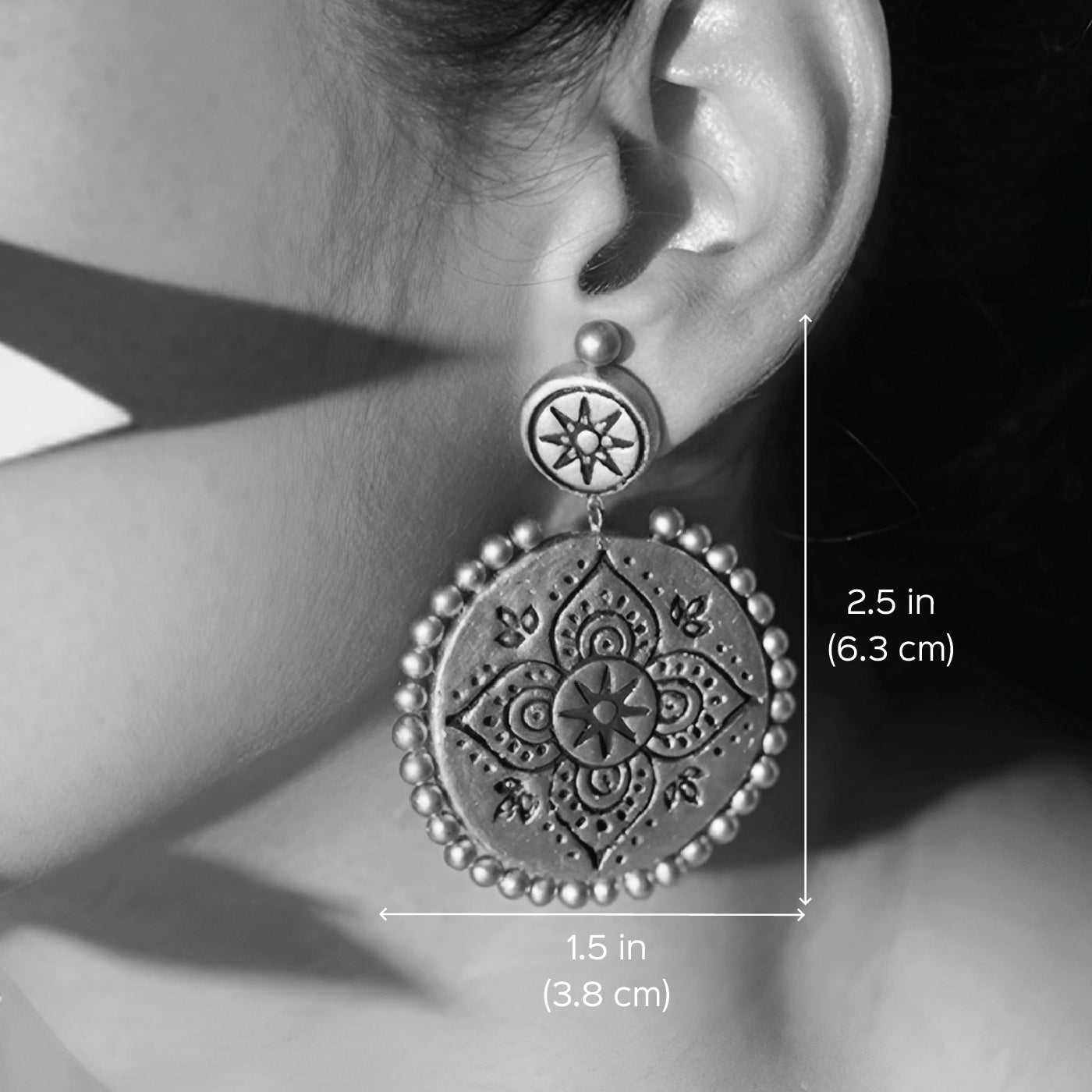 - Handcrafted from natural terracotta, they feature a round base adorned with intricate black hand-painted motifs.