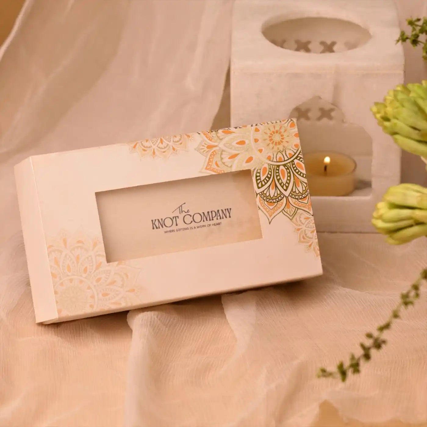 Presented in a beautifully designed box with roli chawal and a festive greeting card.