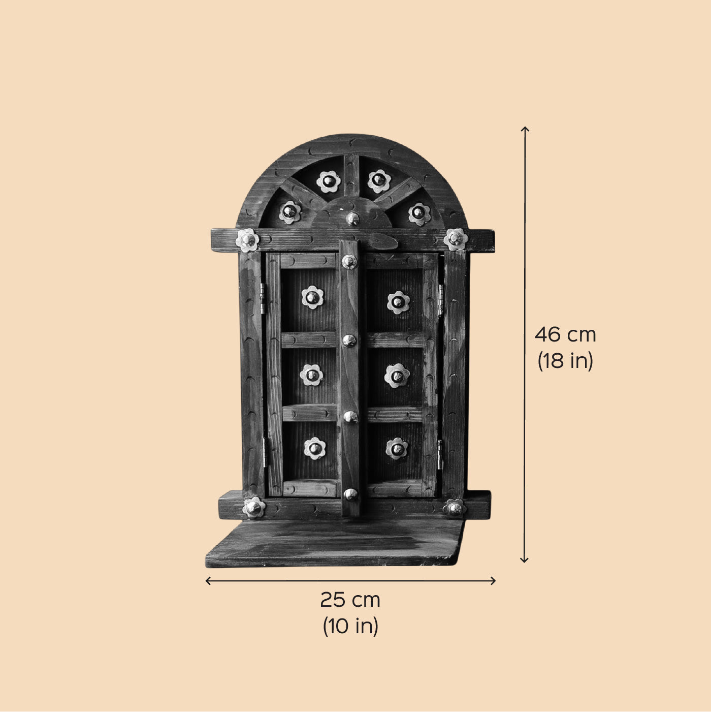 - A handcrafted wooden jharokha in a regal green and gold palette inspired by heritage Rajasthani design.