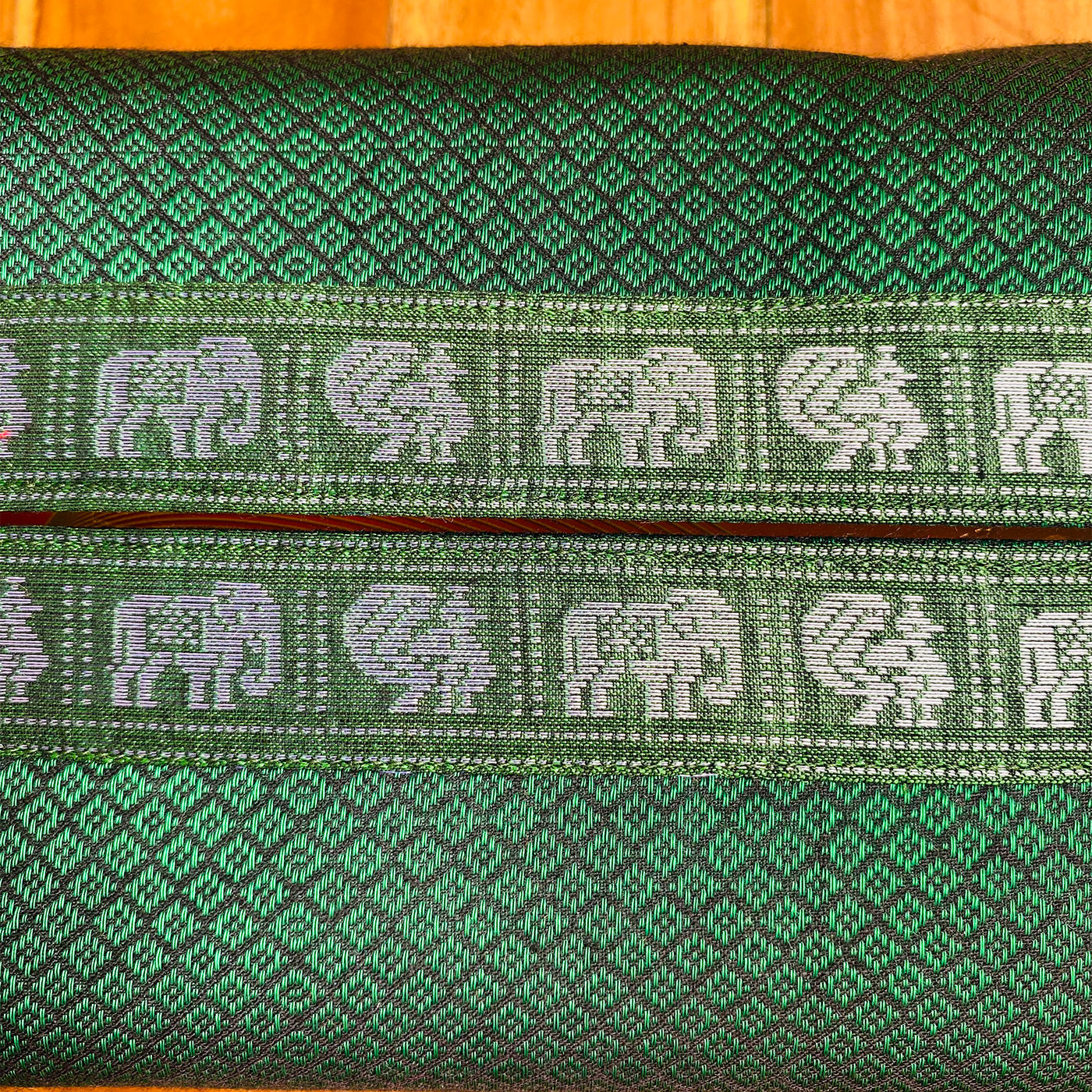 - Intricately woven in Karnataka, it showcases three traditional patterns with an elephant-peacock motif at the top.