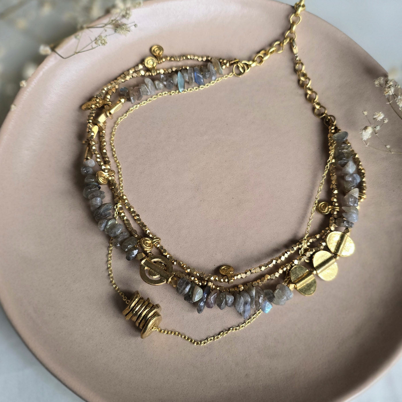 • Hand-textured brass charms are interspersed between the strands, adding warmth and artisanal contrast.