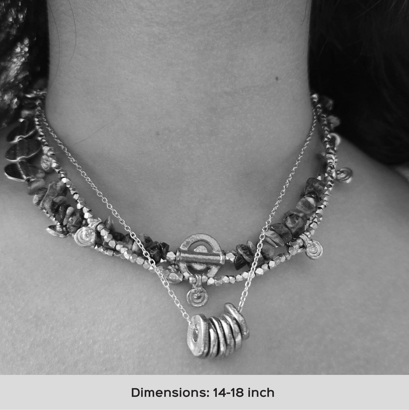 - The multi-strand silhouette creates depth and texture, making it a versatile piece for festive celebrations or mindful everyday wear.