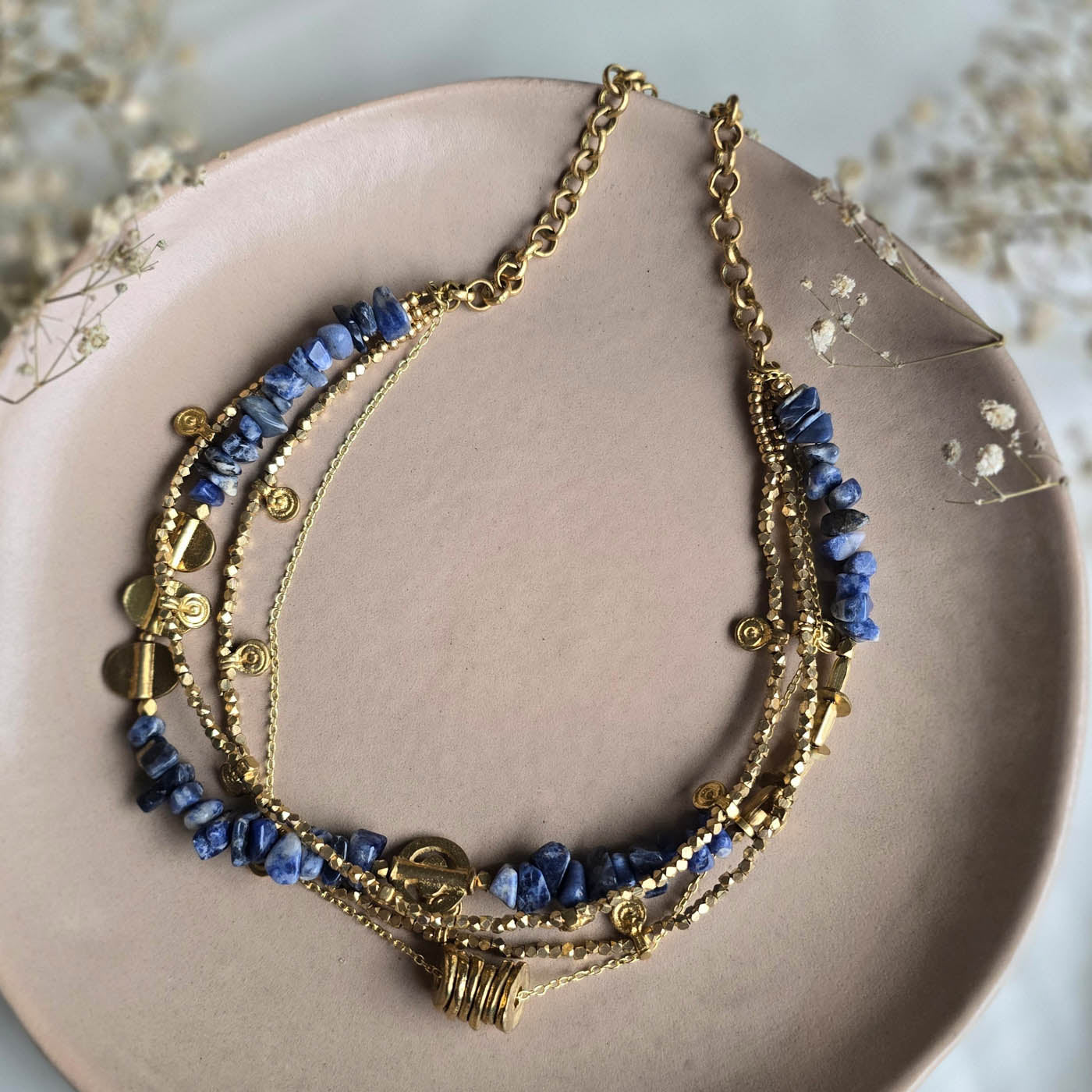 - A striking fusion of celestial blue lapis and glowing brass comes alive in this layered necklace.