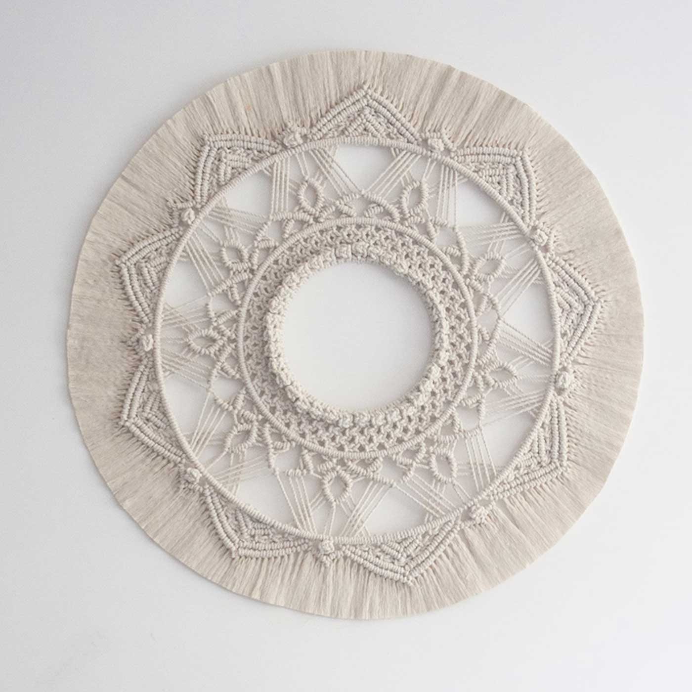 • Intricately knotted cotton cords create a mesmerizing floral mandala pattern, adding texture and visual depth to your home décor.