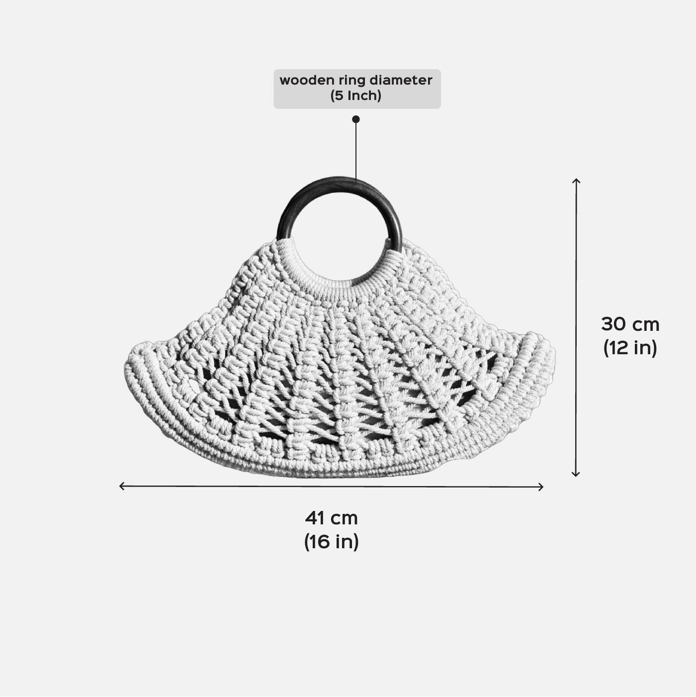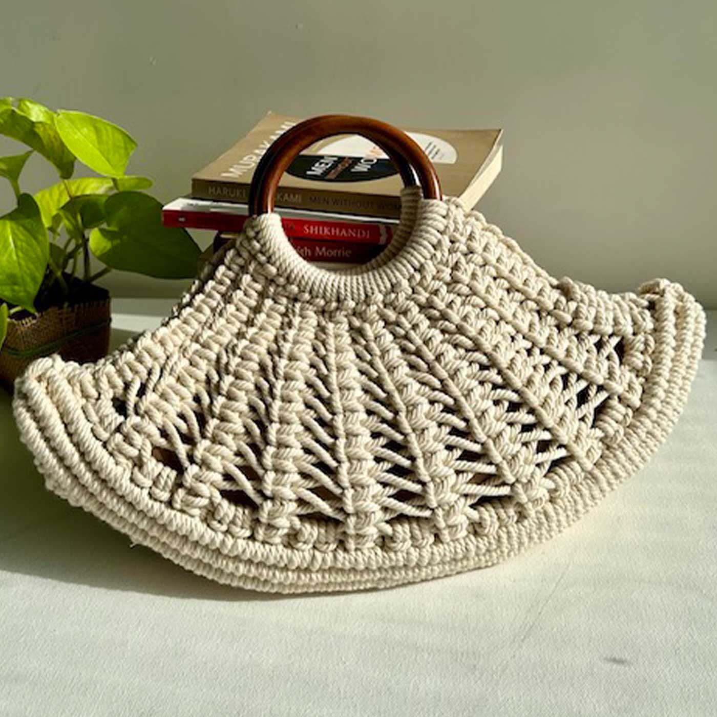 - Handcrafted macrame handbag featuring premium wooden handles for a statement look.