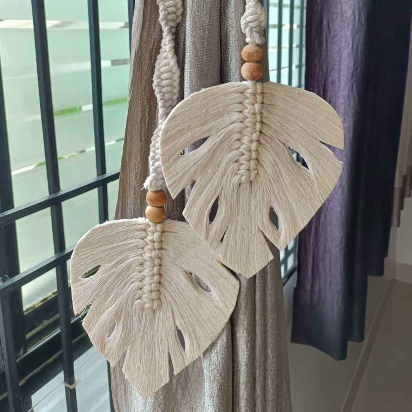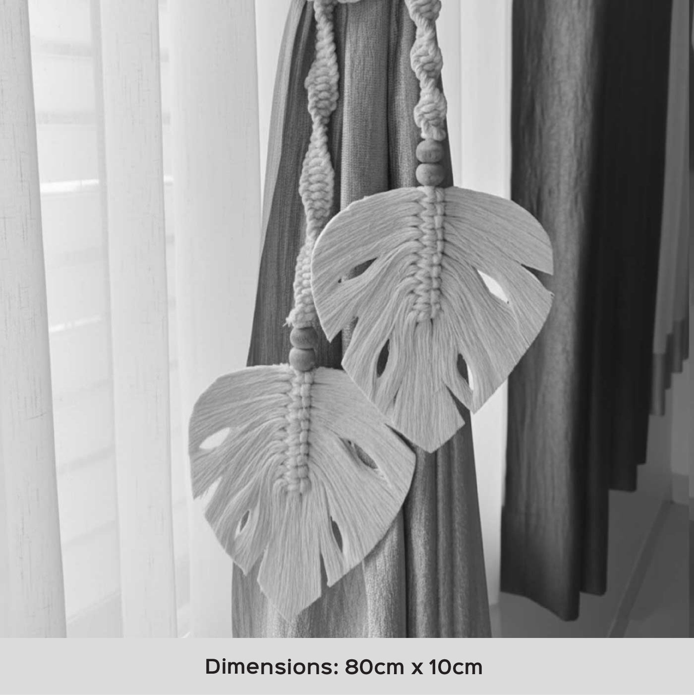 - Handcrafted macrame curtain ties featuring iconic monstera leaf motifs along the rope.