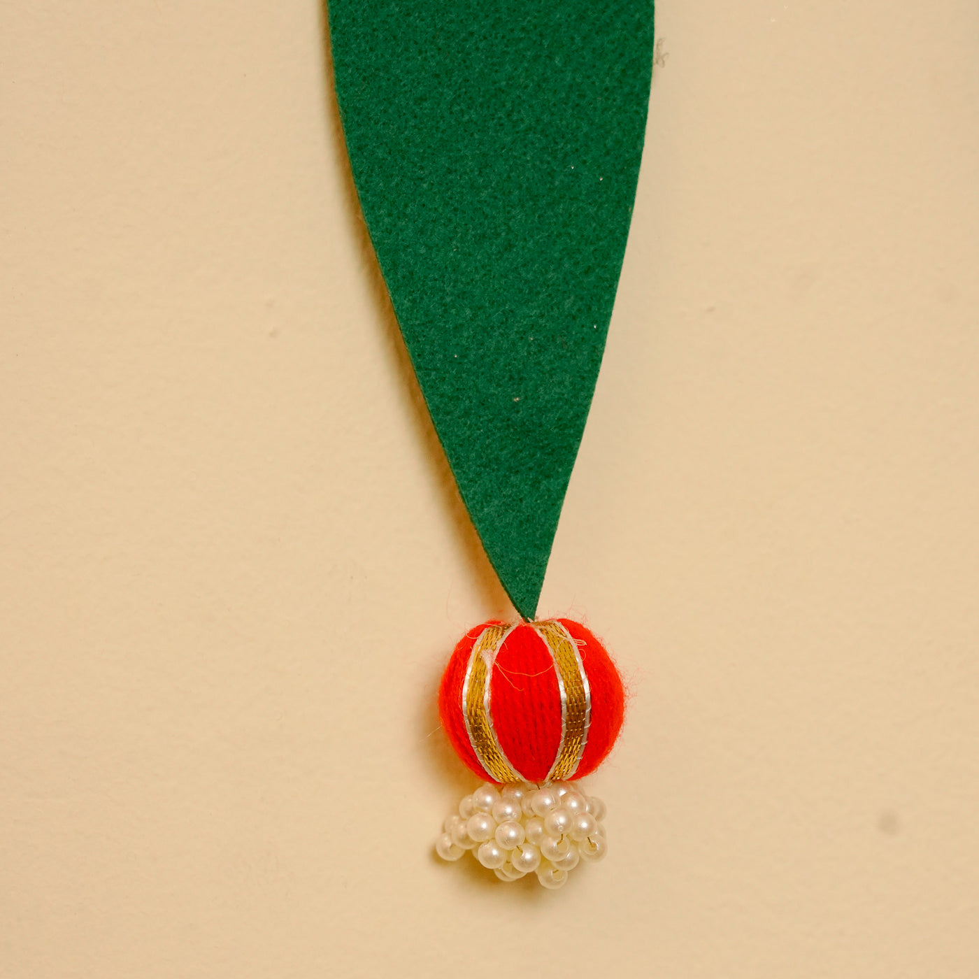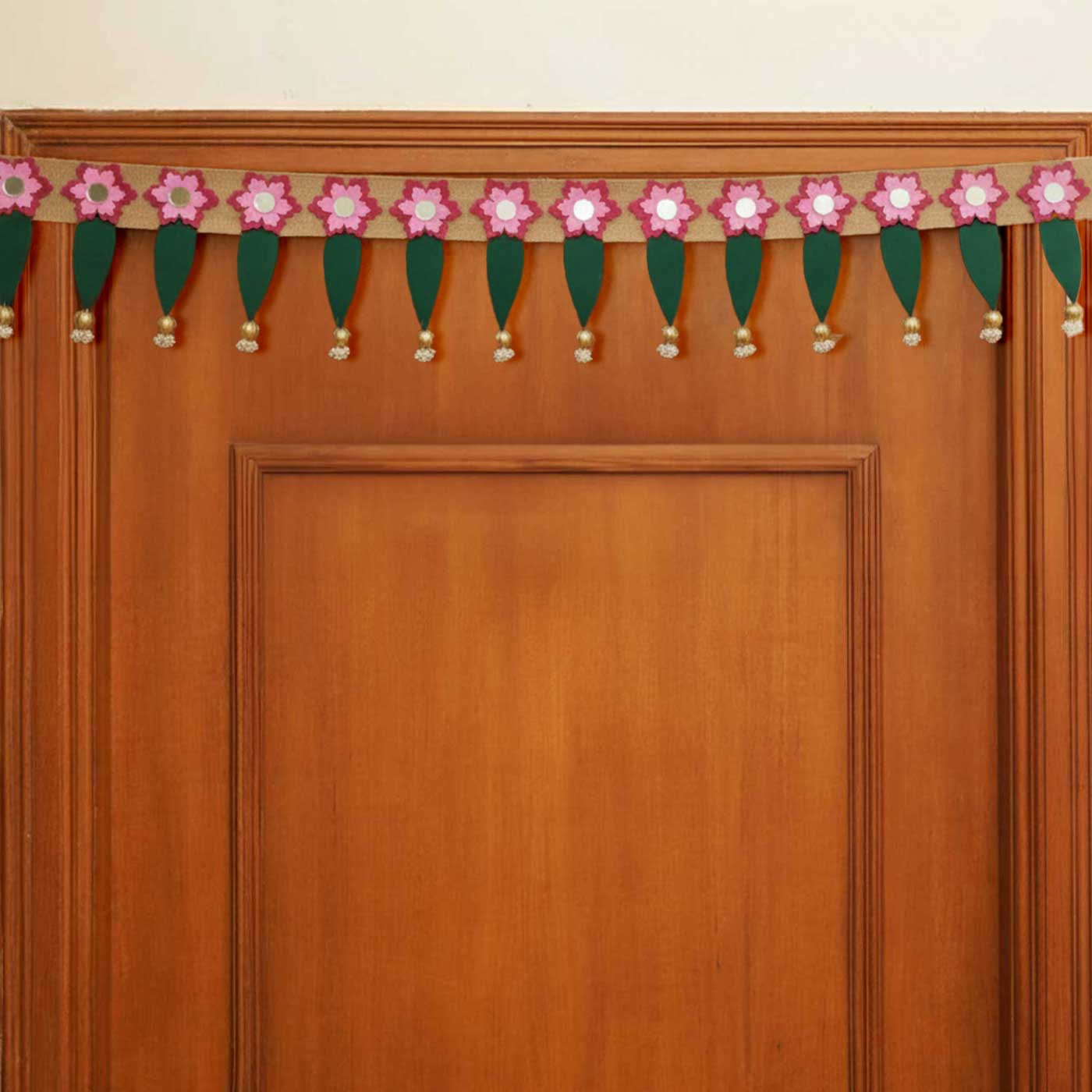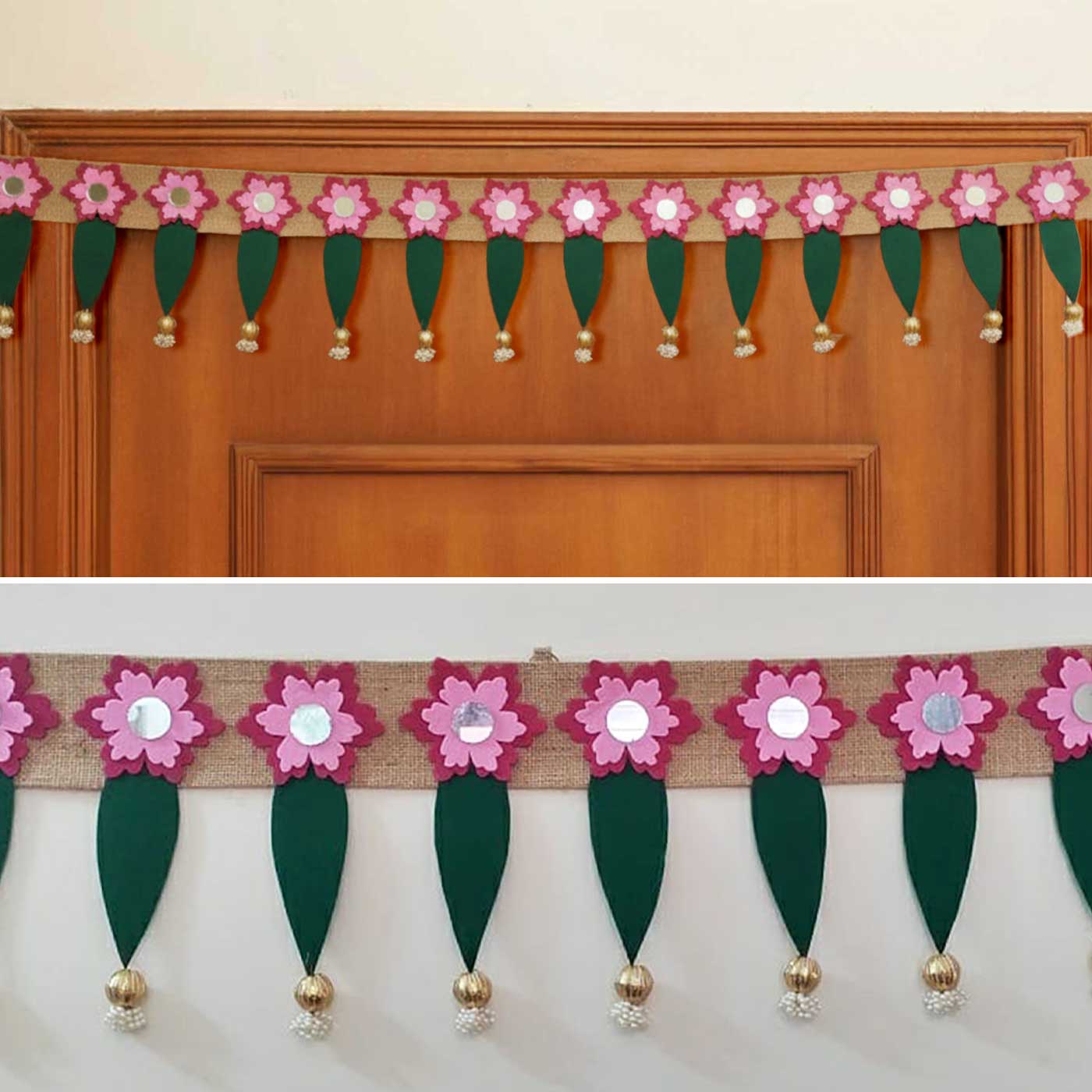 - Featuring elegant Ashok Patta-inspired felt flowers and jute base, it adds a handcrafted artisanal touch to your entryway or mandir.