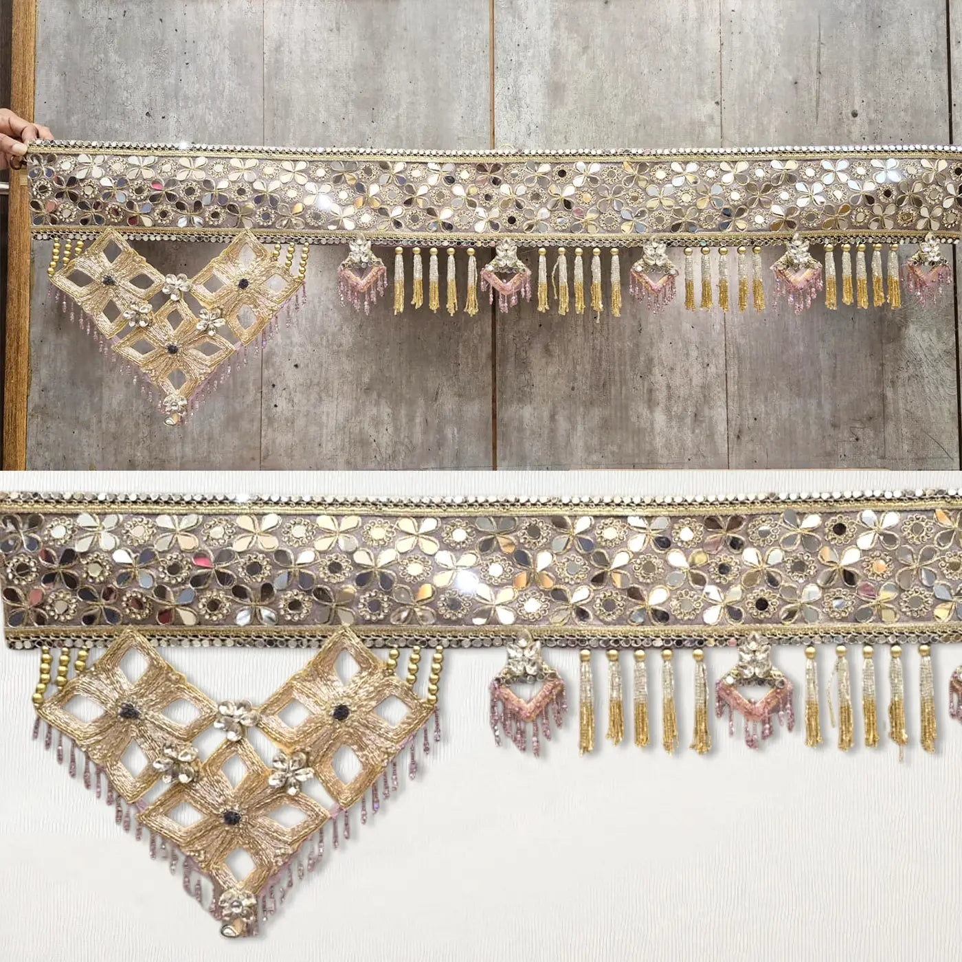 - This toran dazzles with intricate mirror work in shimmering gold and silver tones.
