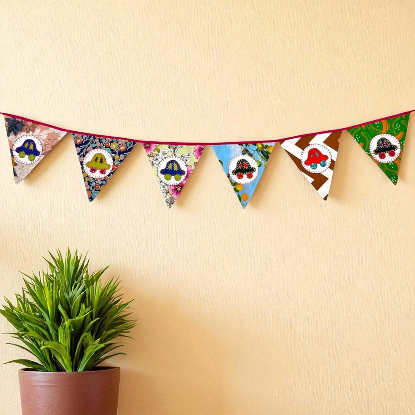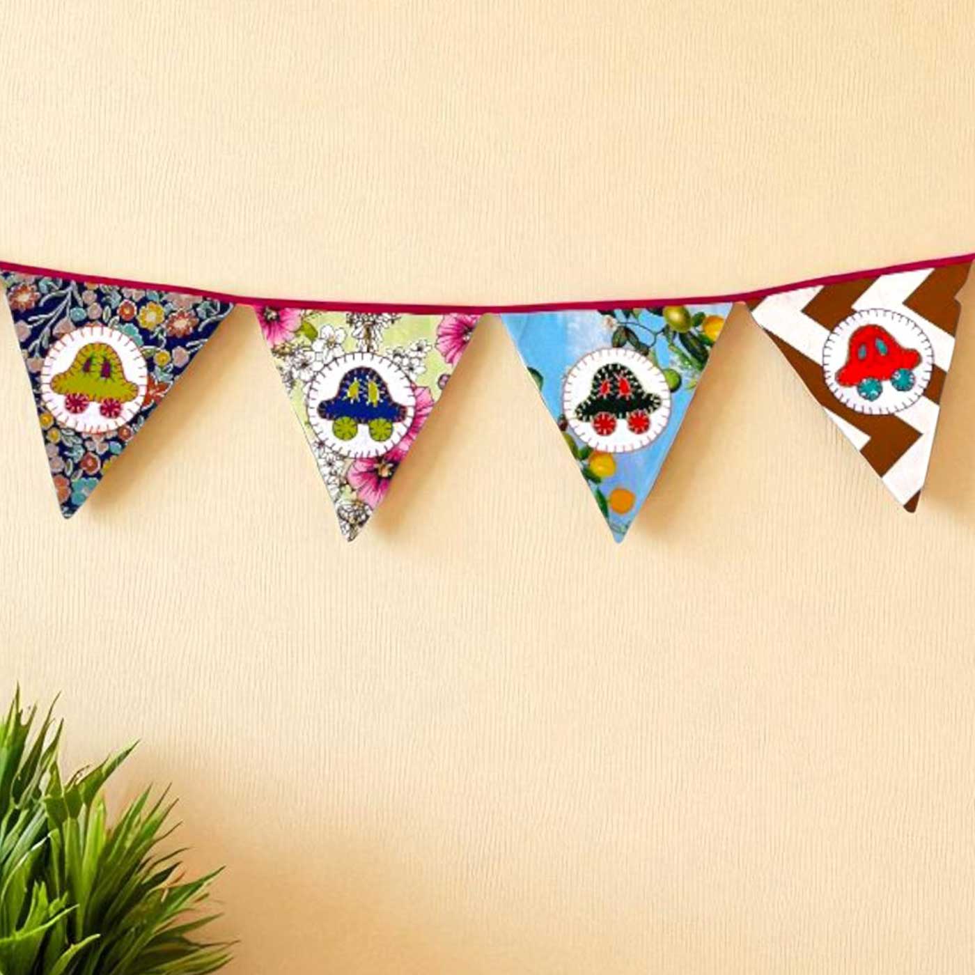 - Add a dash of fun to any space with this multicolored bunting featuring adorable car motifs, handcrafted from upcycled fabric.