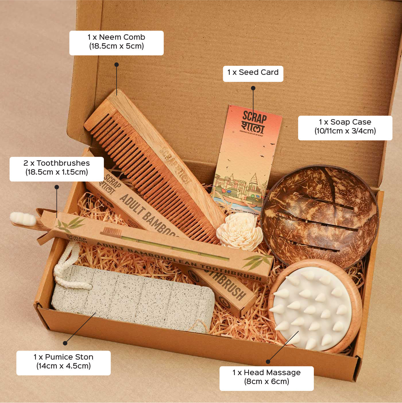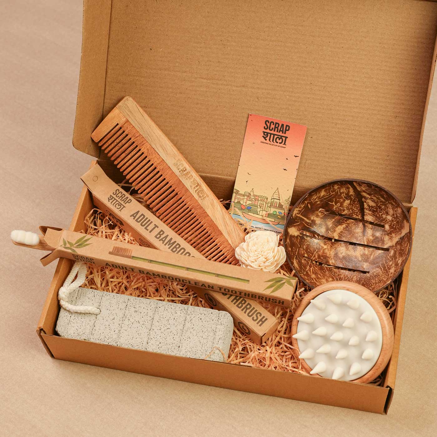 • Includes eco-friendly essentials like coconut soap case, bamboo toothbrushes, neem comb, wooden head massager, and pumice stone.