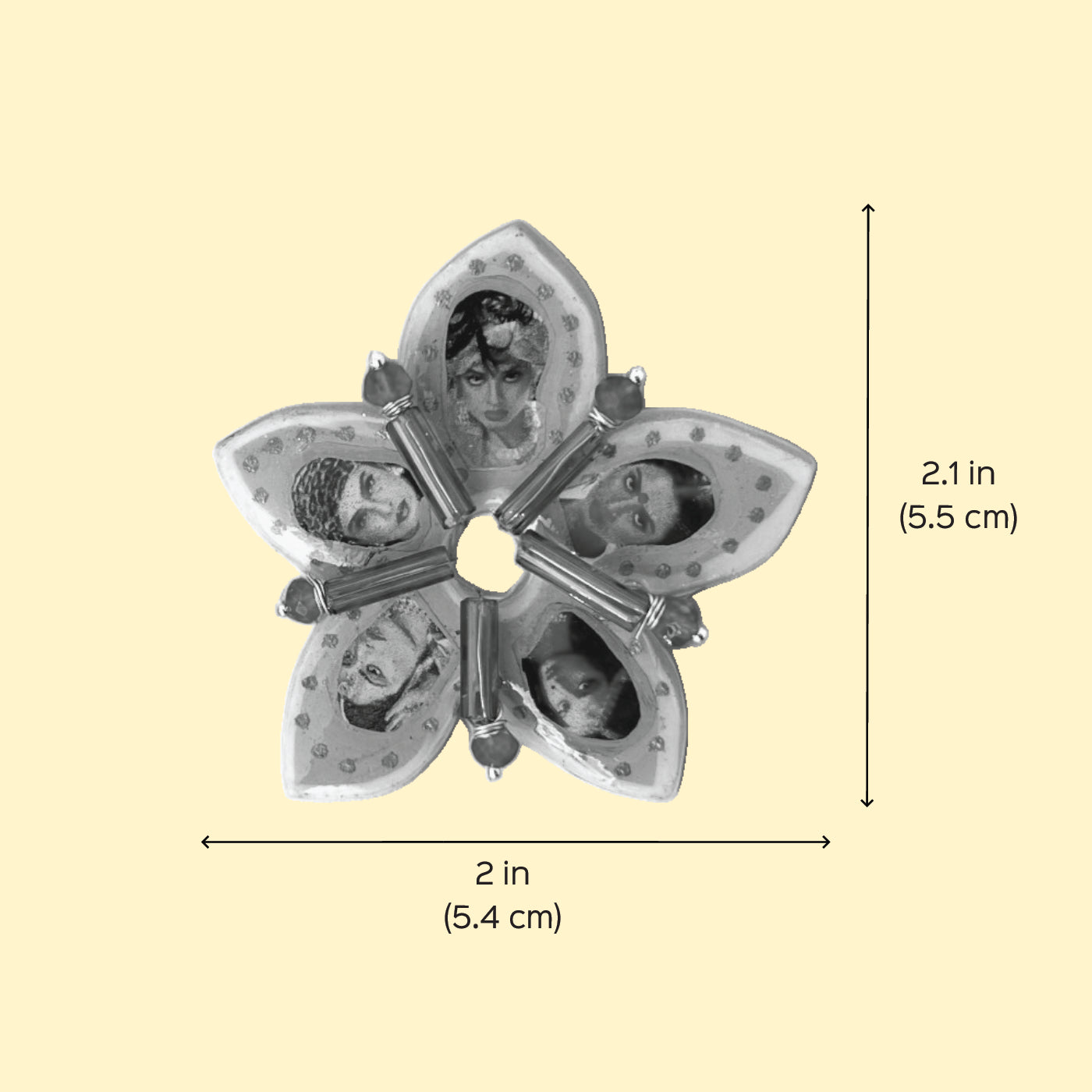- Each piece is handcrafted from polymer clay, with painted floral details and carefully placed imagery of Rekha herself.