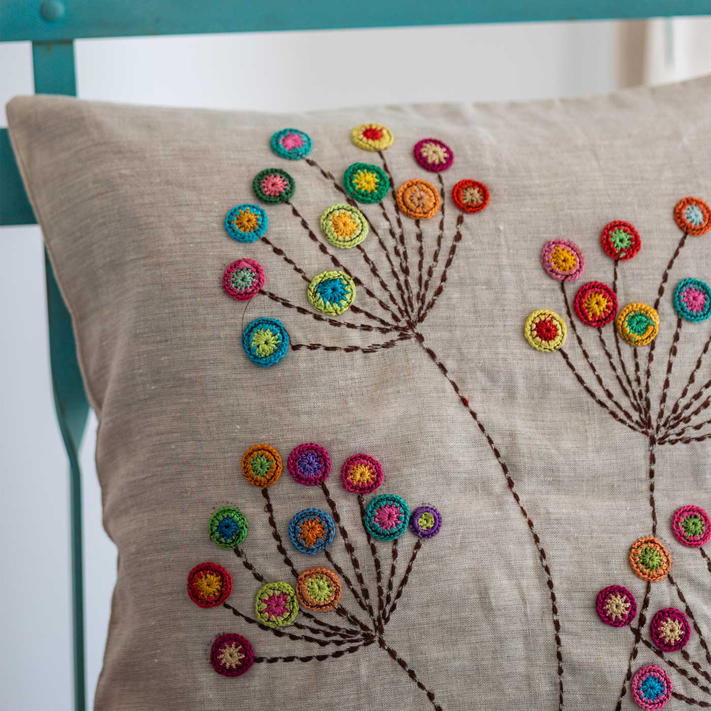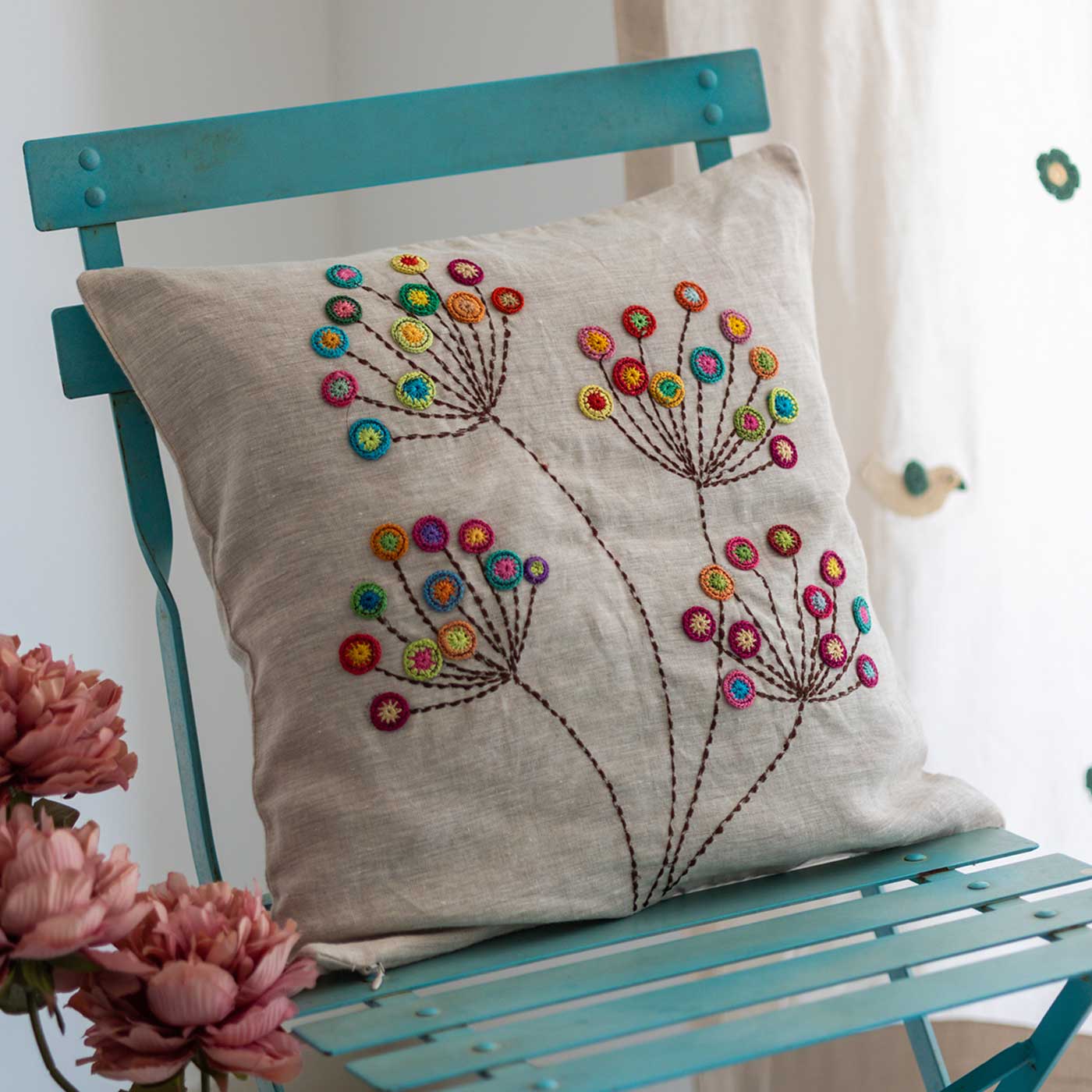 • Nestle into vibrant comfort with these nature-inspired crocheted cushions, crafted to bring warmth and personality to any space.