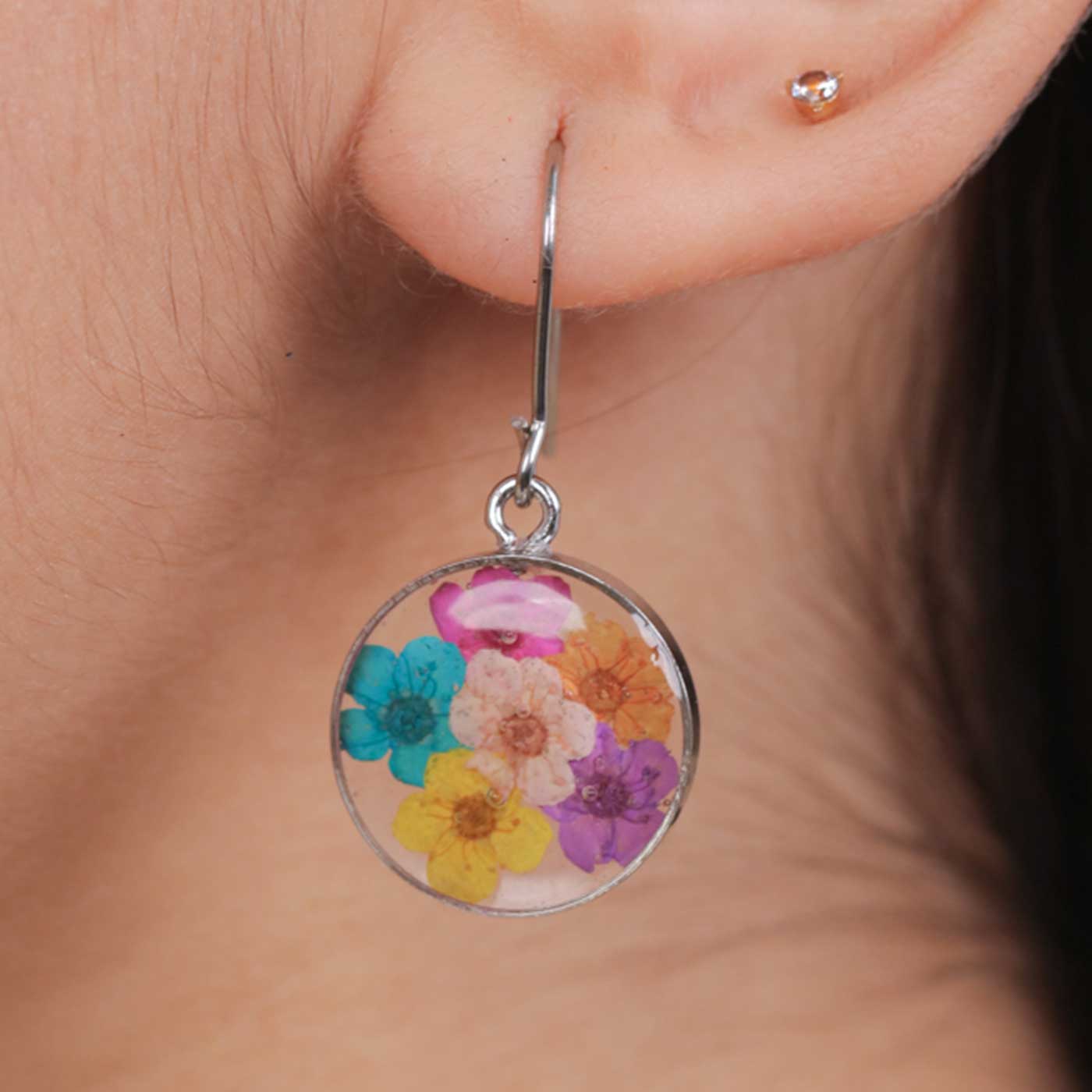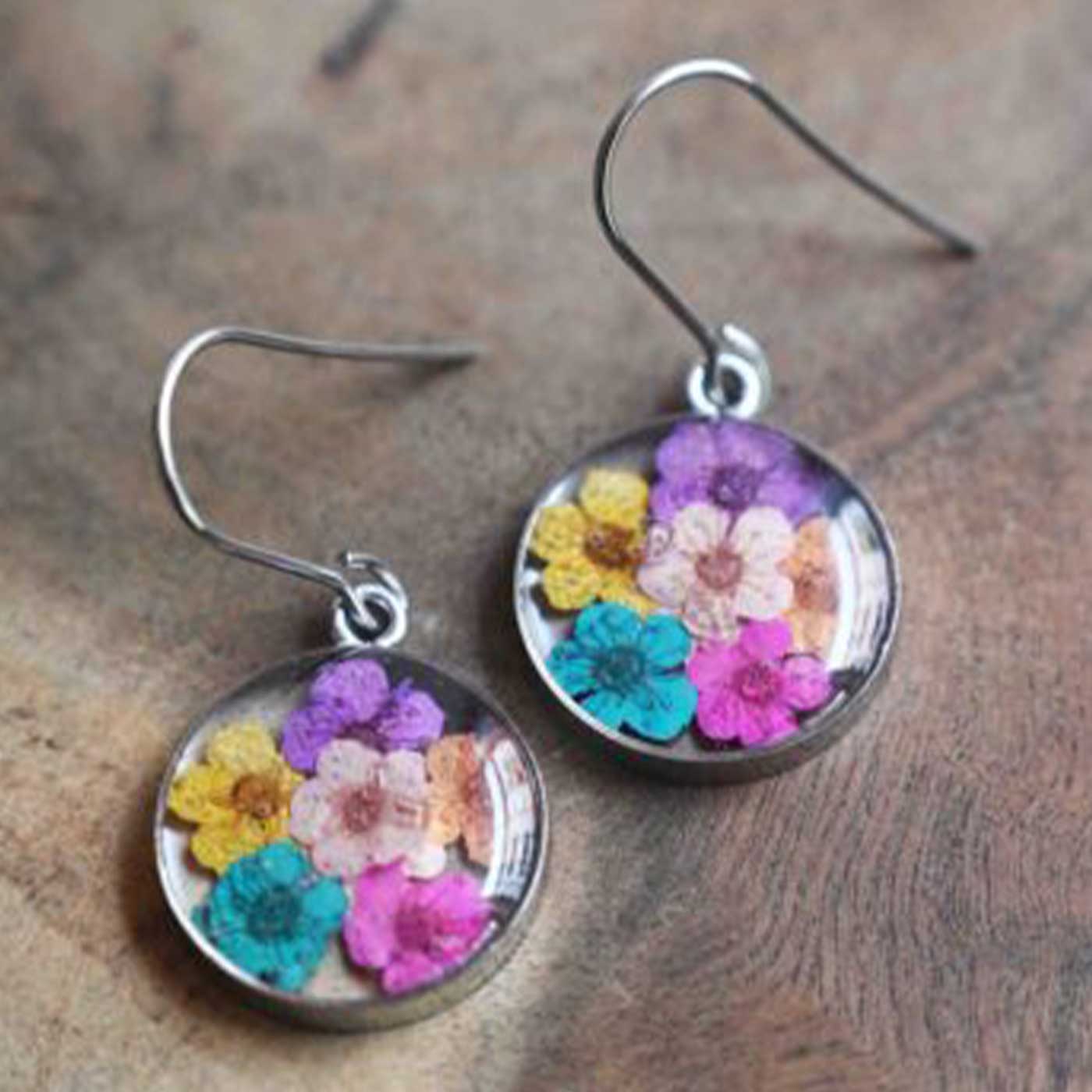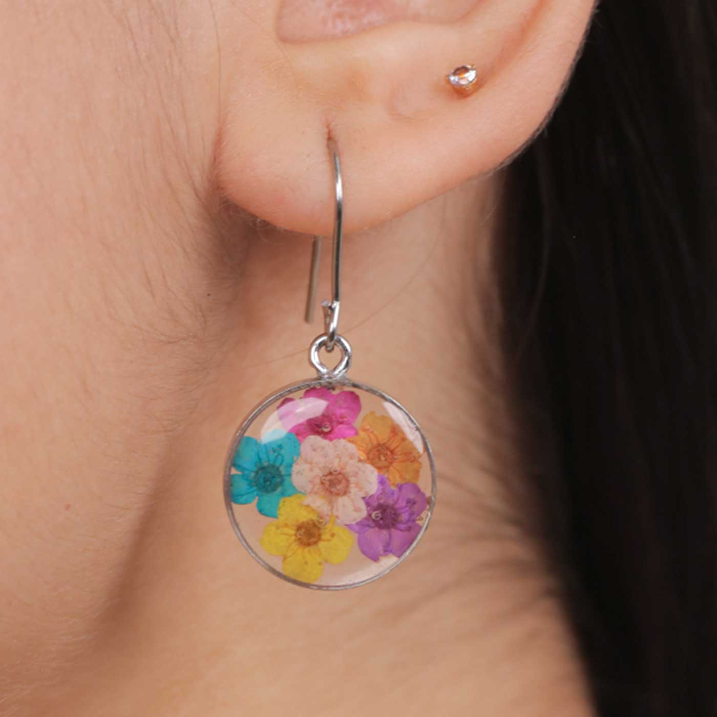 Make a statement with these handcrafted brass earrings featuring preserved flowers.