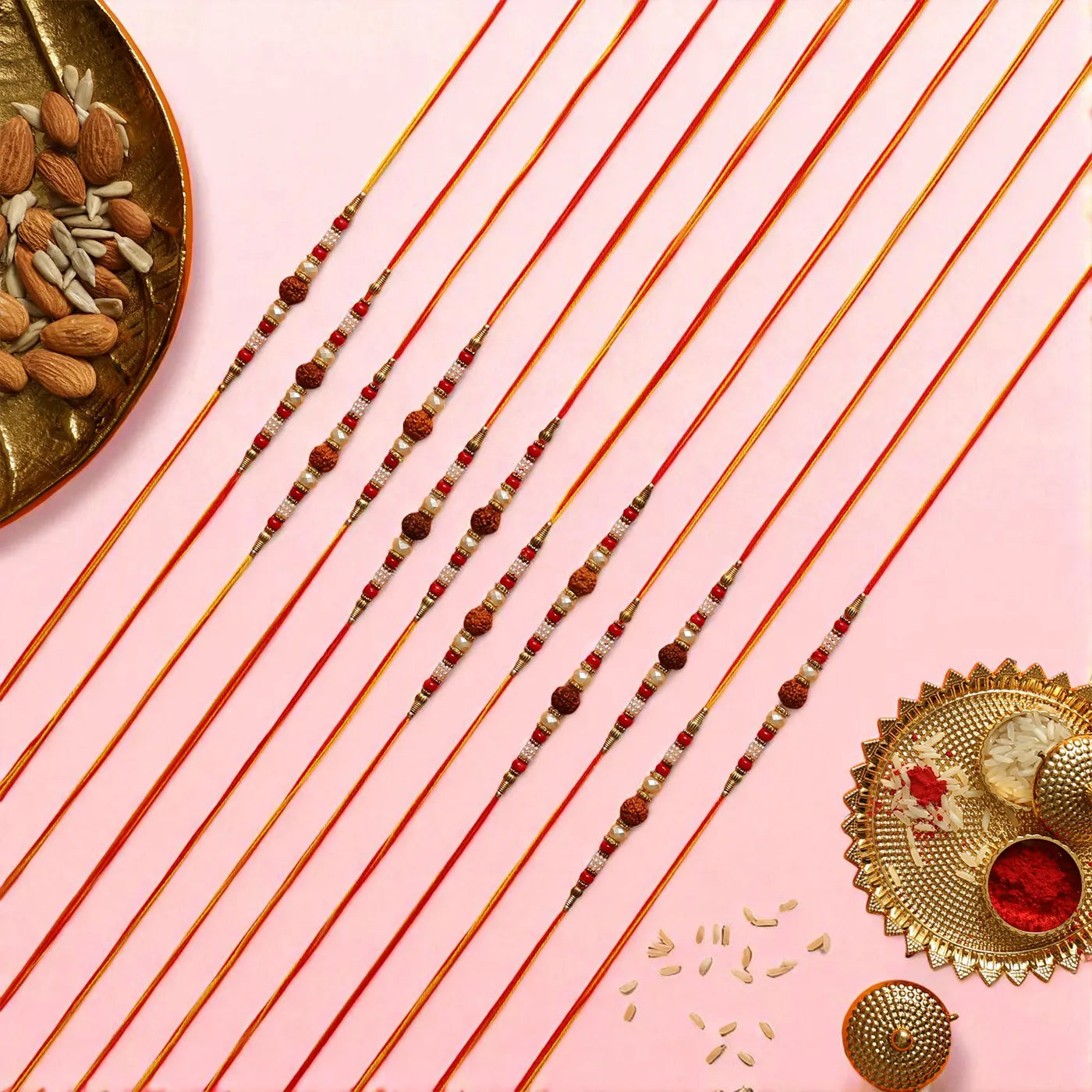 Each Rakhi features sacred Rudraksha beads and durable cotton threads for lasting comfort.