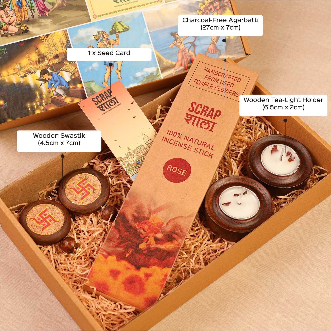 - Includes eco-friendly essentials like charcoal-free agarbatti, reusable tea-light holders, and a plantable seed card.