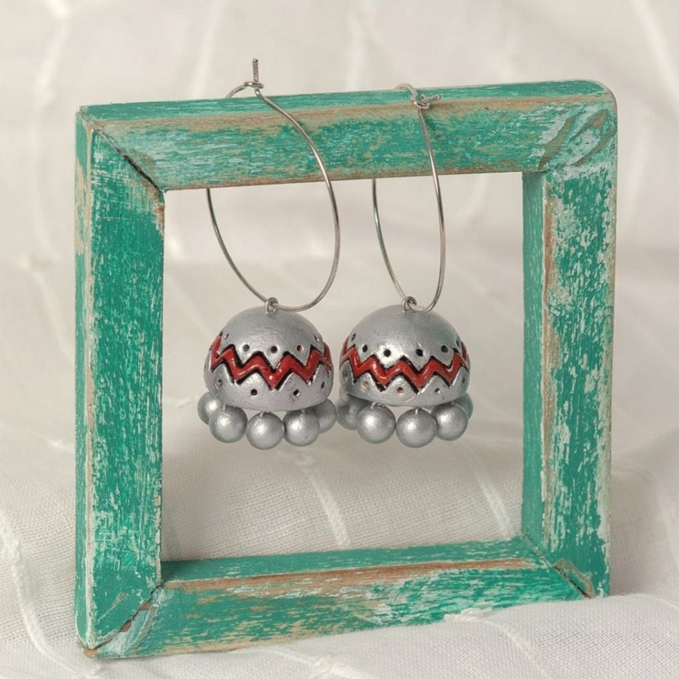 - A classic silver hoop is paired with a dome-shaped terracotta pendant for a refined fusion aesthetic.