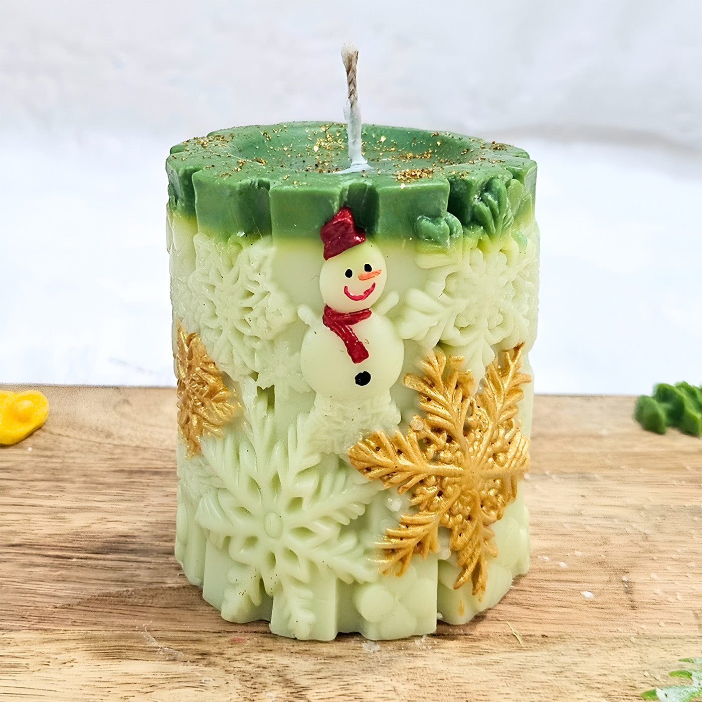 - Add a serene winter touch to your décor with this handcrafted snowflake-textured soy pillar candle.