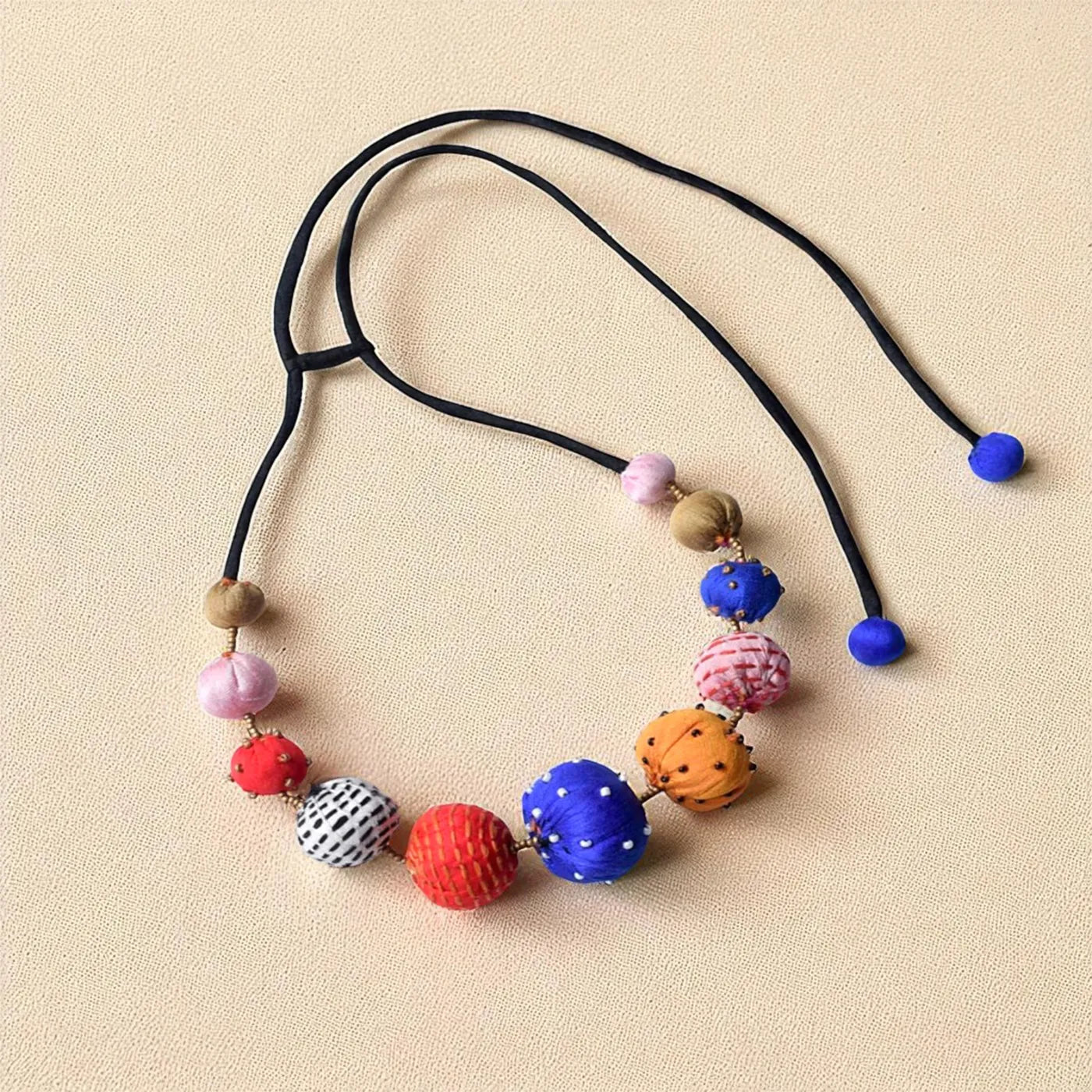 - Handcrafted with round silk fabric baubles, each is detailed with kantha stitches or tiny beads.