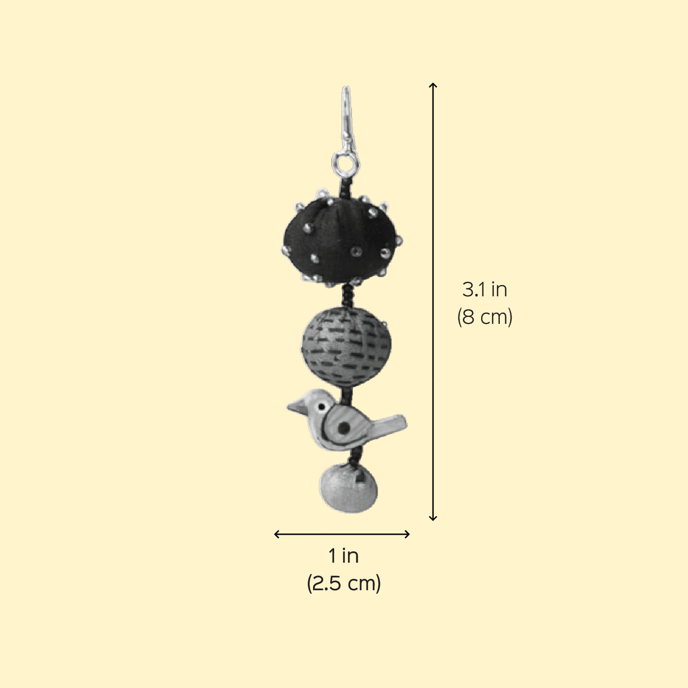 - Each piece includes a wooden bird bead surrounded by hand-stitched silk elements.