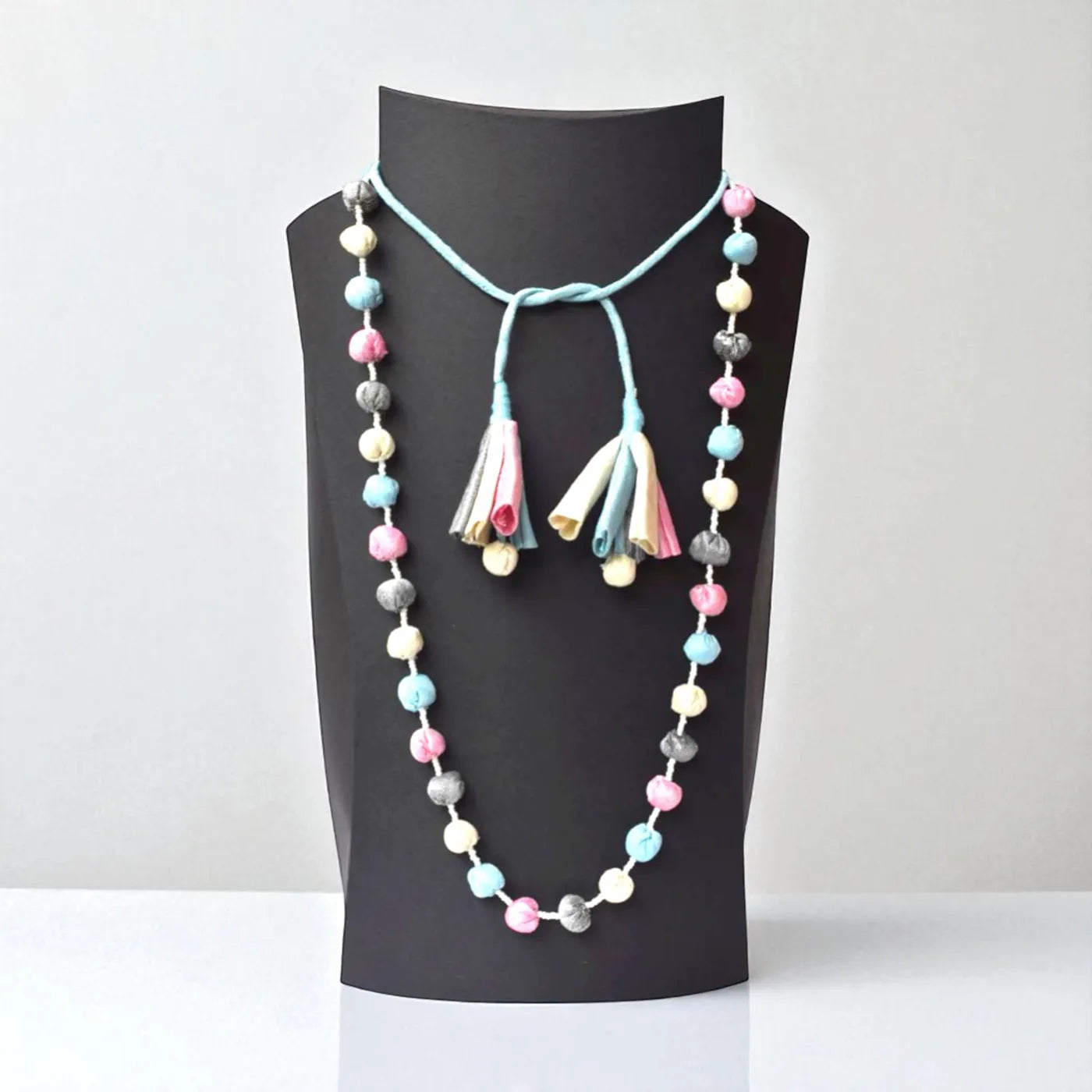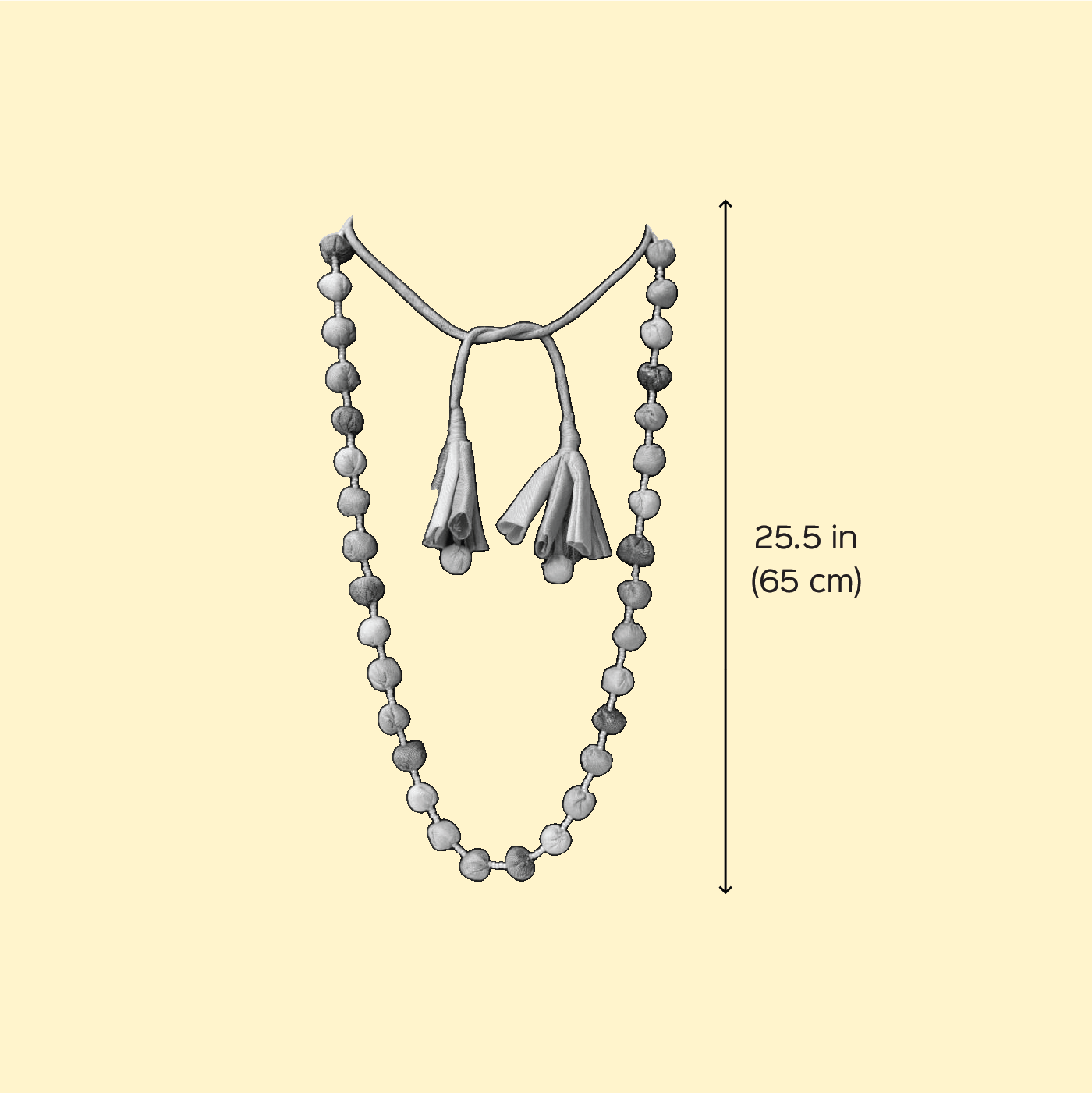 - It features a long strand of silk fabric beads finished with playful tassels at the end.