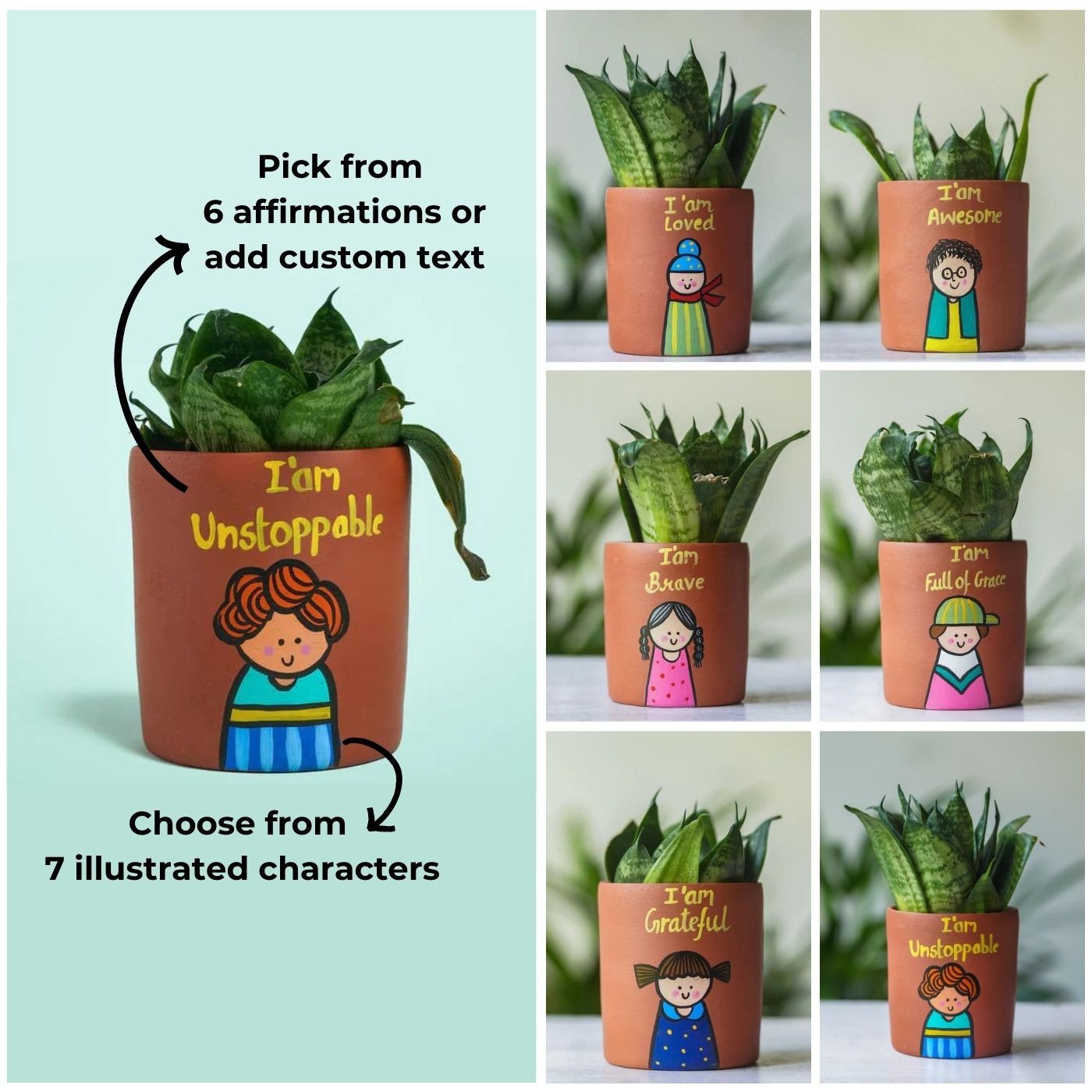 Customize this planter with an affirmation & an illustrated character of your choice.