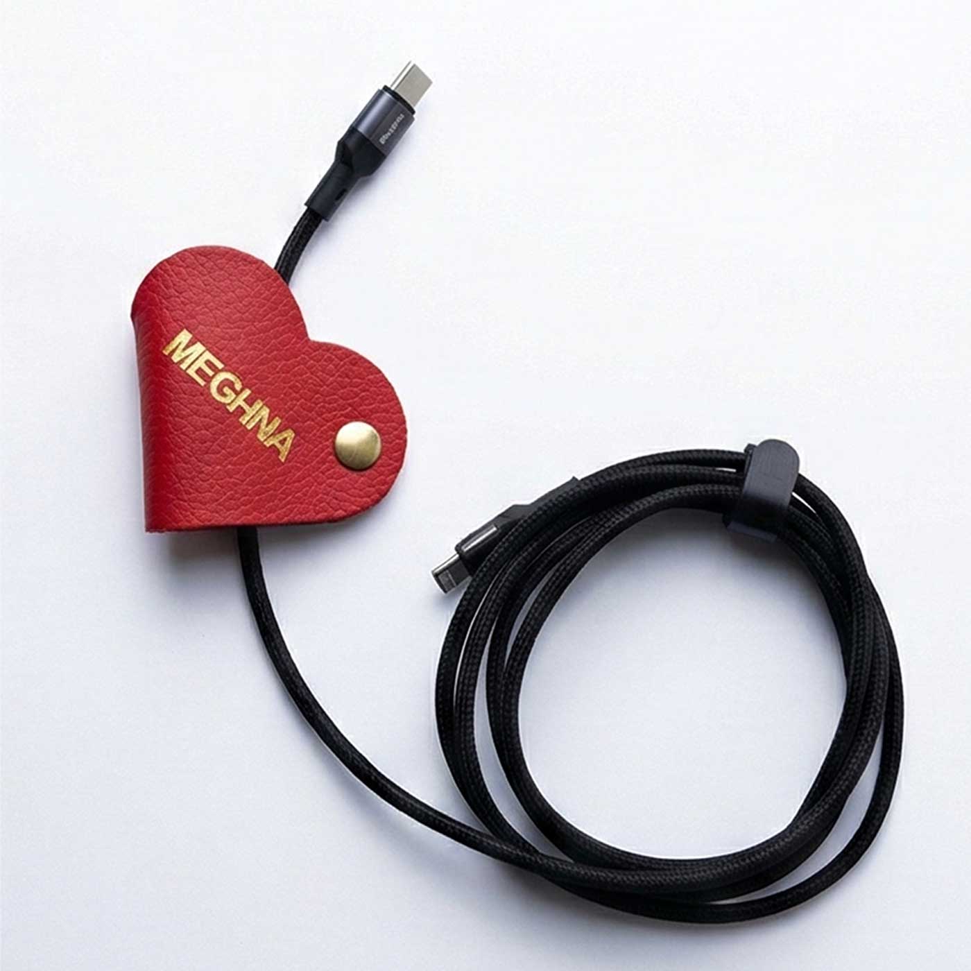 - Handcrafted in premium leather and engraved with your name or initials, it wraps neatly around chargers, earphones, and cords with a secure snap closure.