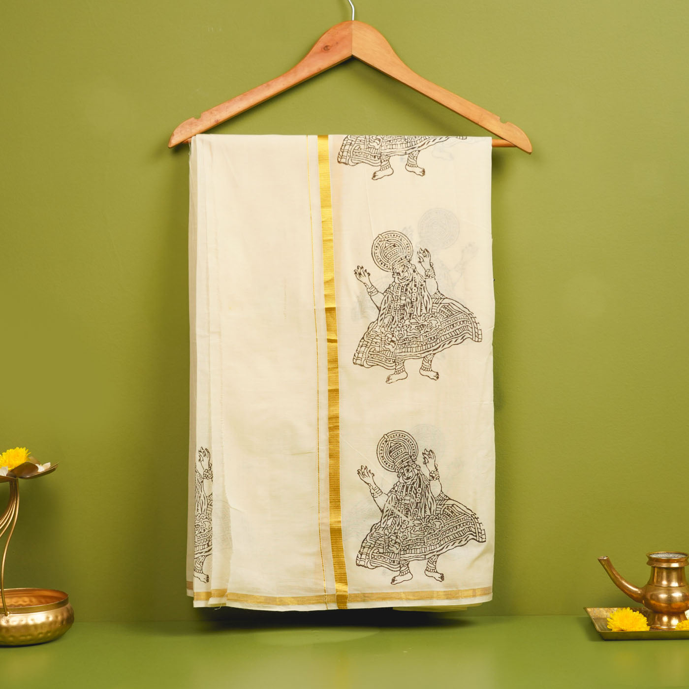 - Hand block printed in Balaramapuram, famed for its authentic Kasavu weaving traditions.