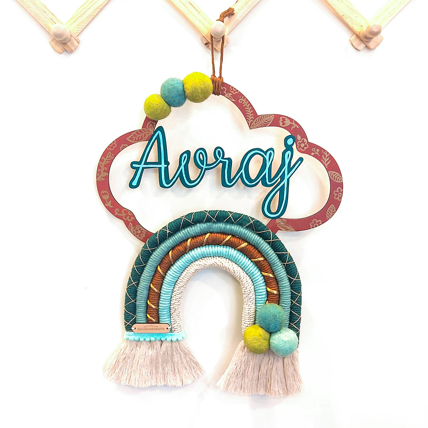 • With layers of rainbow macrame cord art, hanging tassels and motifs, this nameplate is meticulously handcrafted with high quality cotton yarn.