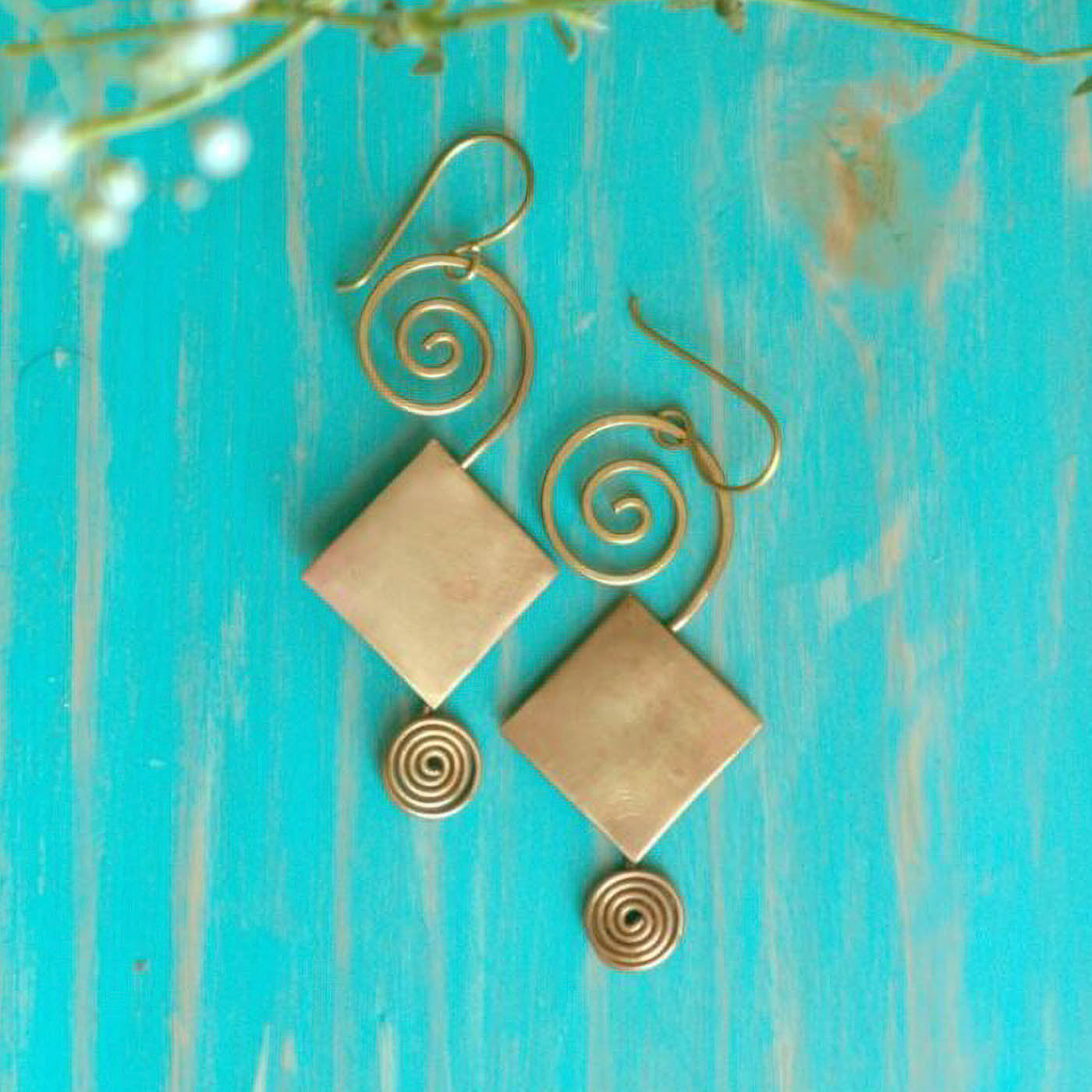 - These earrings feature an intricate rhombus-shaped spiral design, handcrafted in brass.