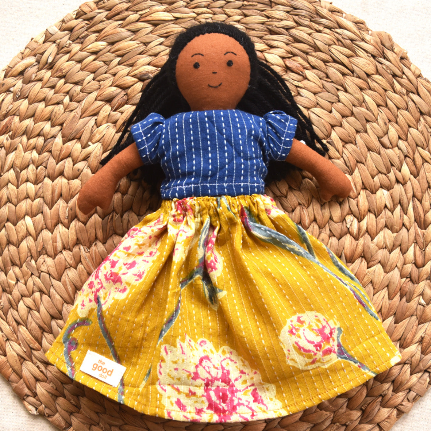 Nilah's (Younger Sister) Malar In Blue & Yellow Dress | Soft Hand-Stitched Sustainable Indian Play Doll