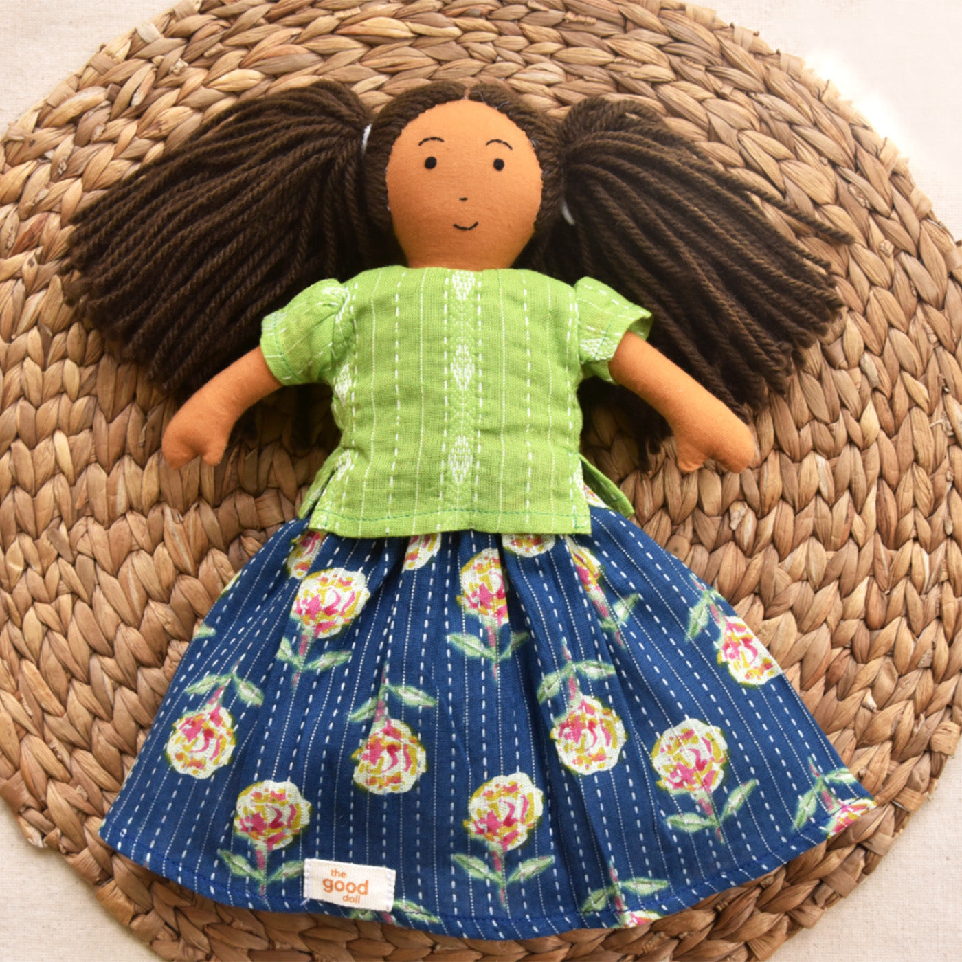 Nilah's (Younger Sister) Mira In Green & Blue Dress | Soft Hand-Stitched Sustainable Indian Play Doll