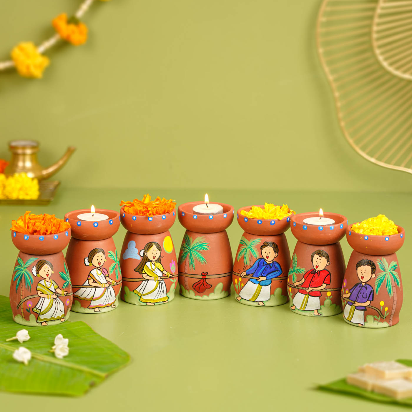 Onam Edition | Hand-painted Clay Tug of War Theme Tealight Holders | Set of 7