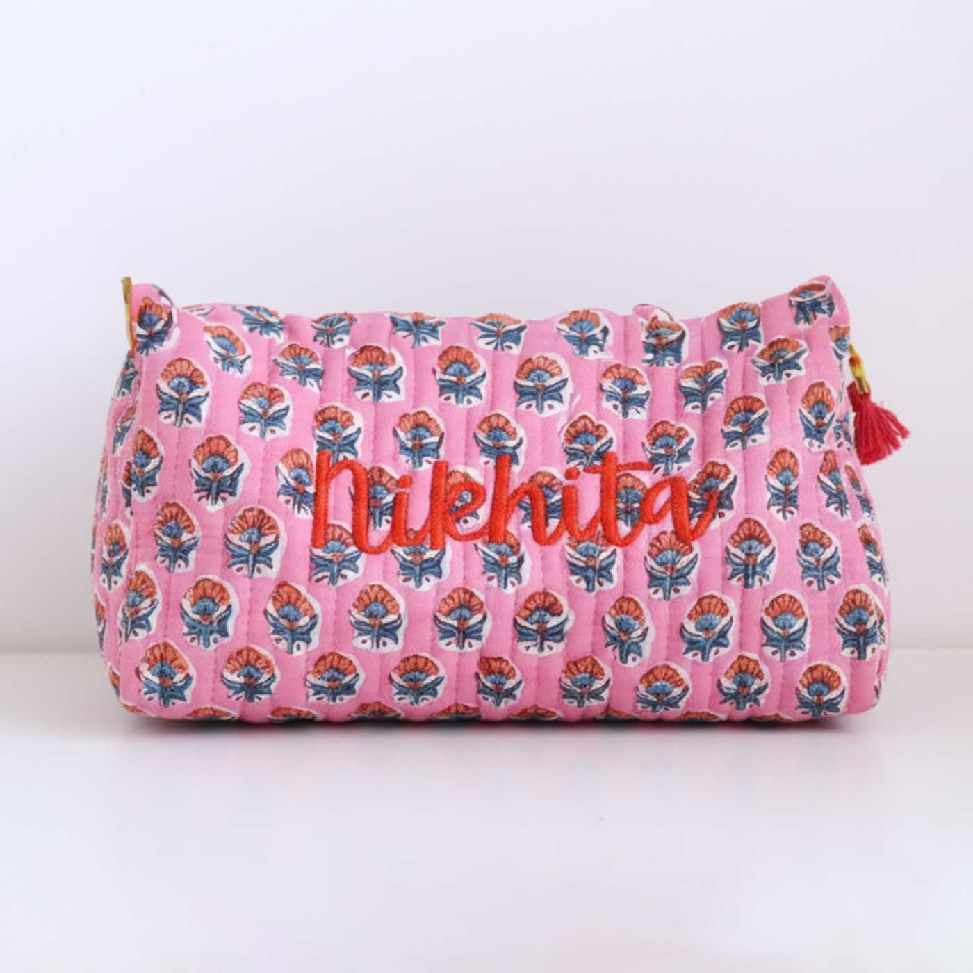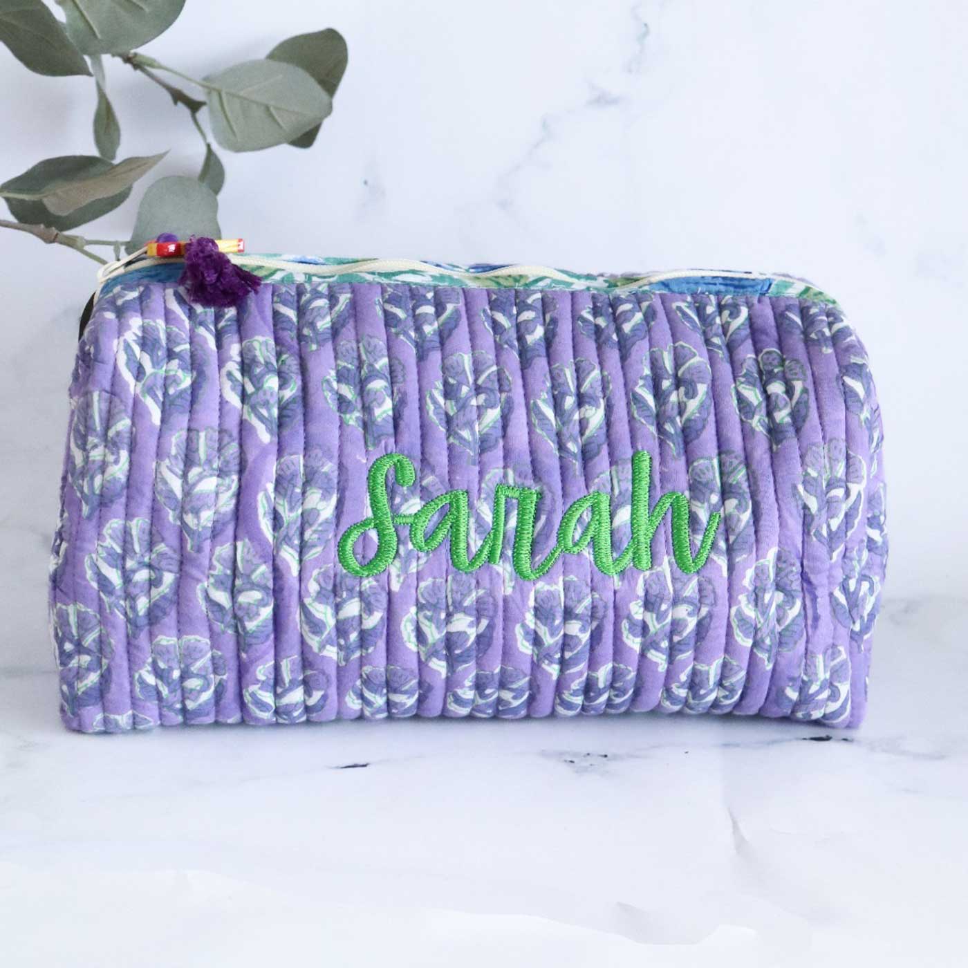 - Brighten someone's day with a personalized block-printed cotton cosmetic pouch.