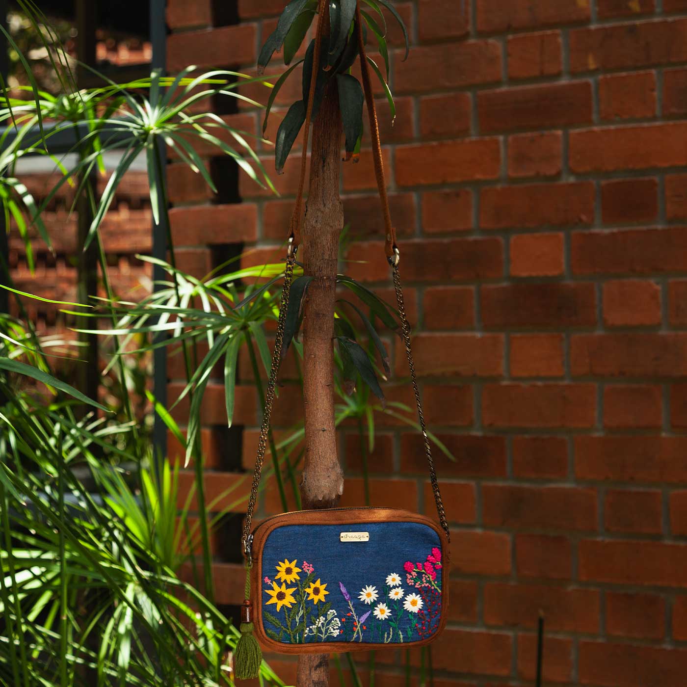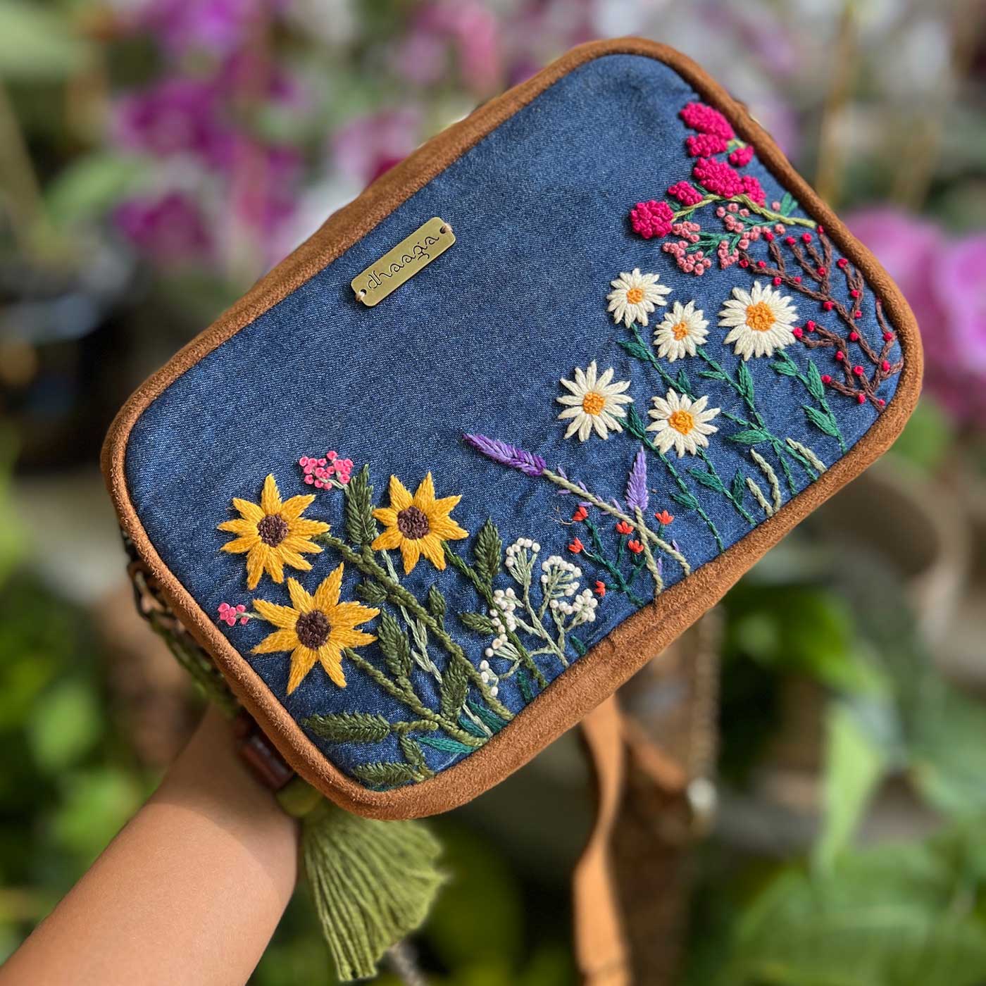Personalized Embroidered Garden Denim Vegan Suede Sling Bag
