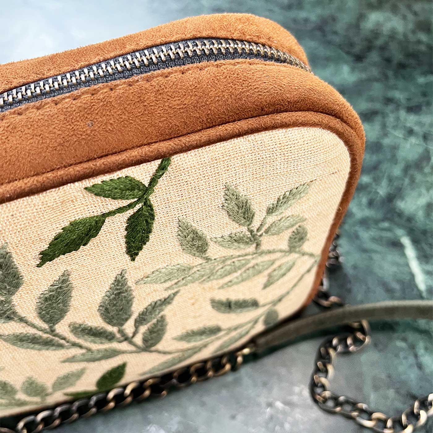 - Personalized Embroidered Vegan Suede Sling Bag combines handcrafted detailing with a soft, structured design for everyday versatility.