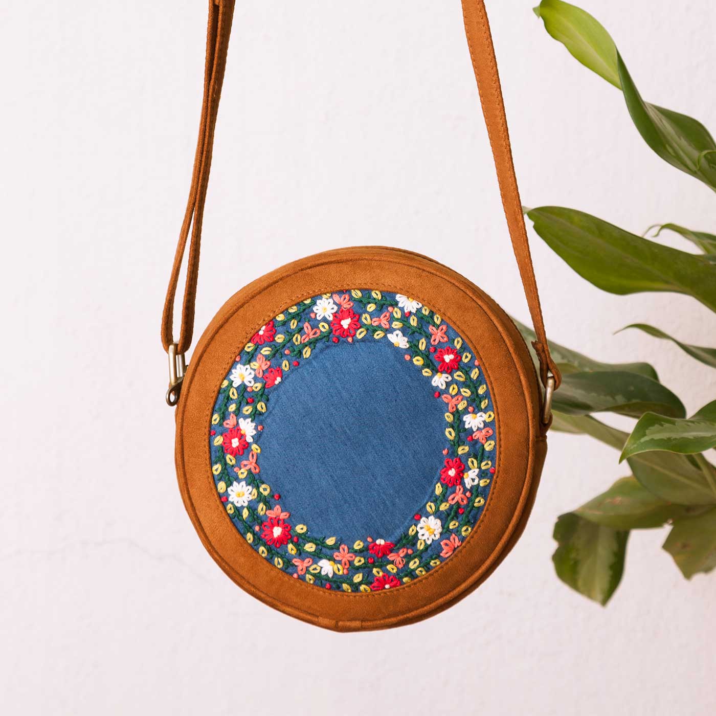 Personalized Embroidered Tan Brown Denim Floral Round Sling Bag