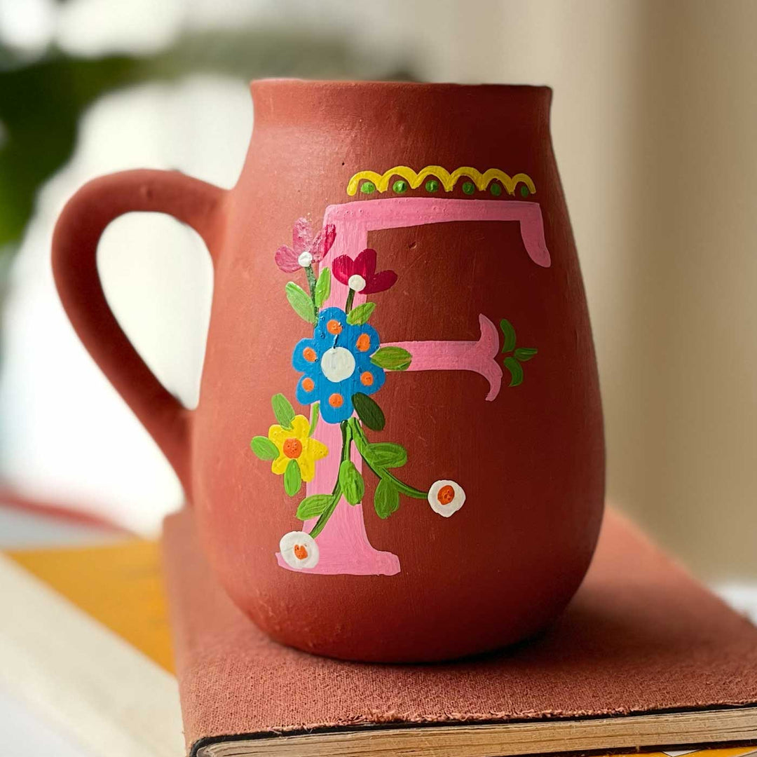 Personalized Hand-painted Floral Theme Monogram Terracotta Mug - F